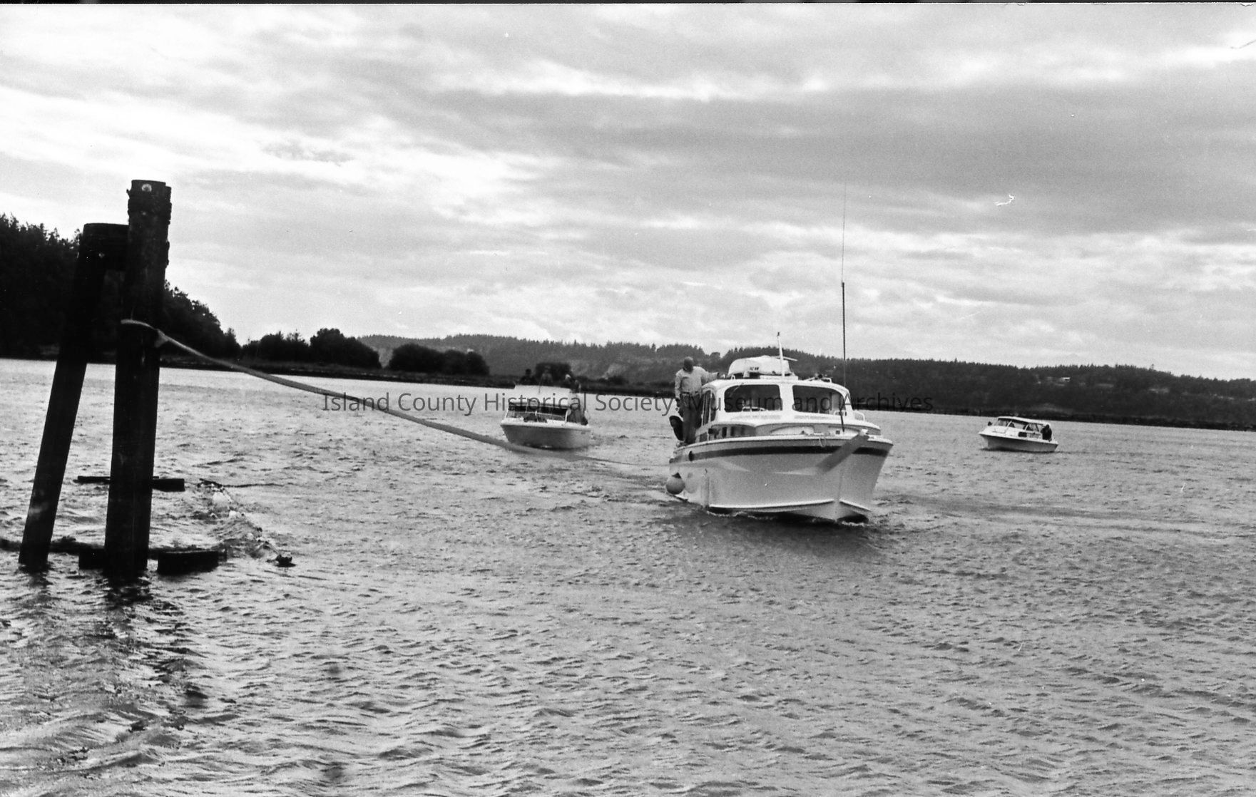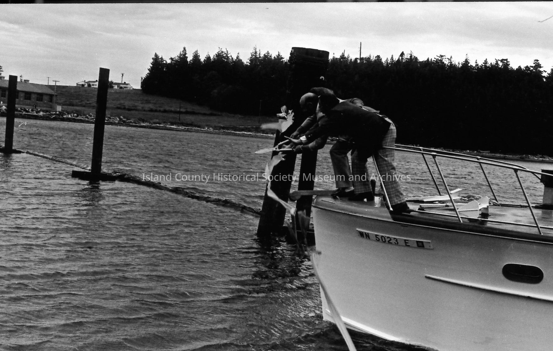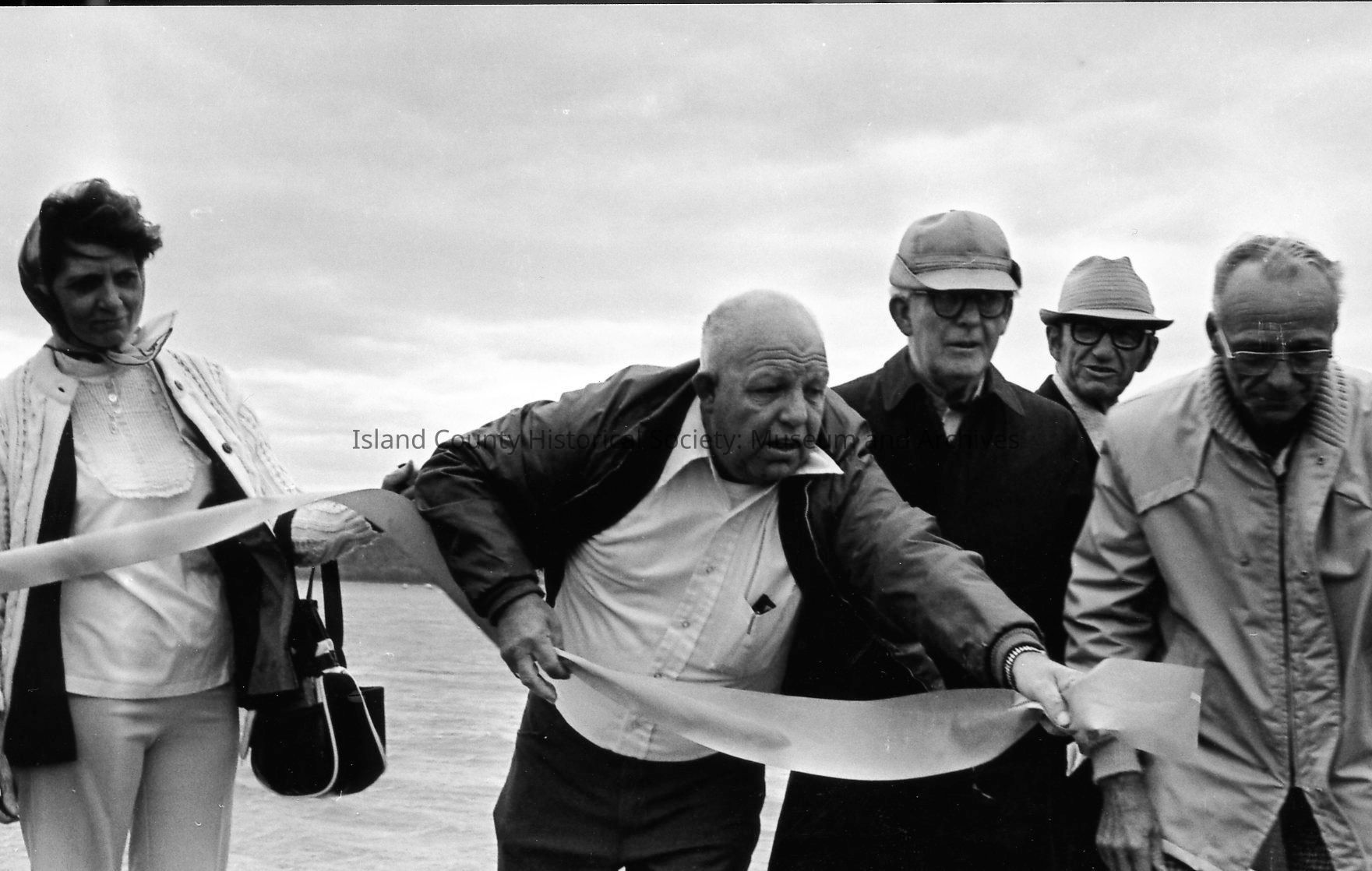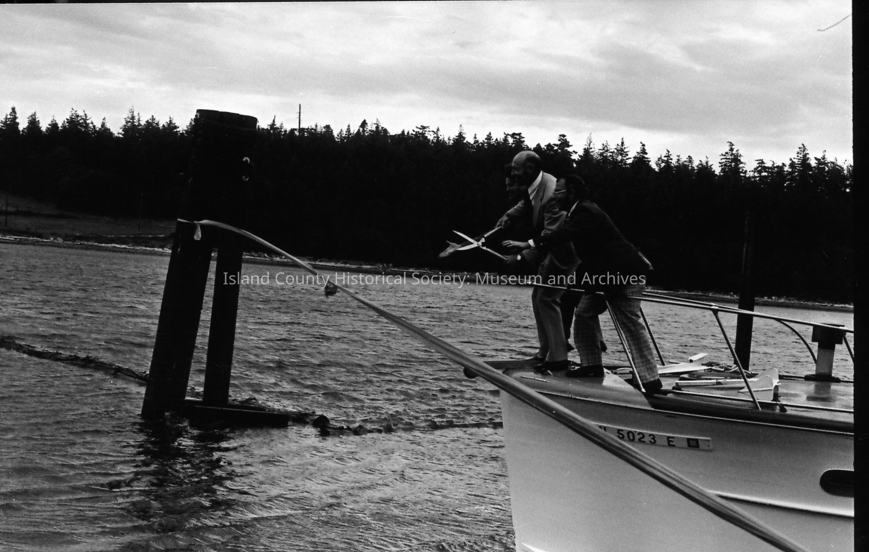 A boat approaches a long ribbon stretched between pilings at the opening of the Oak Harbor Marina in 1974. Mayor Al Koetje and Congressman Lloyd Meeds and a third person are at the bow holding a large shears, preparing to cut the ribbon.Photograph Details
