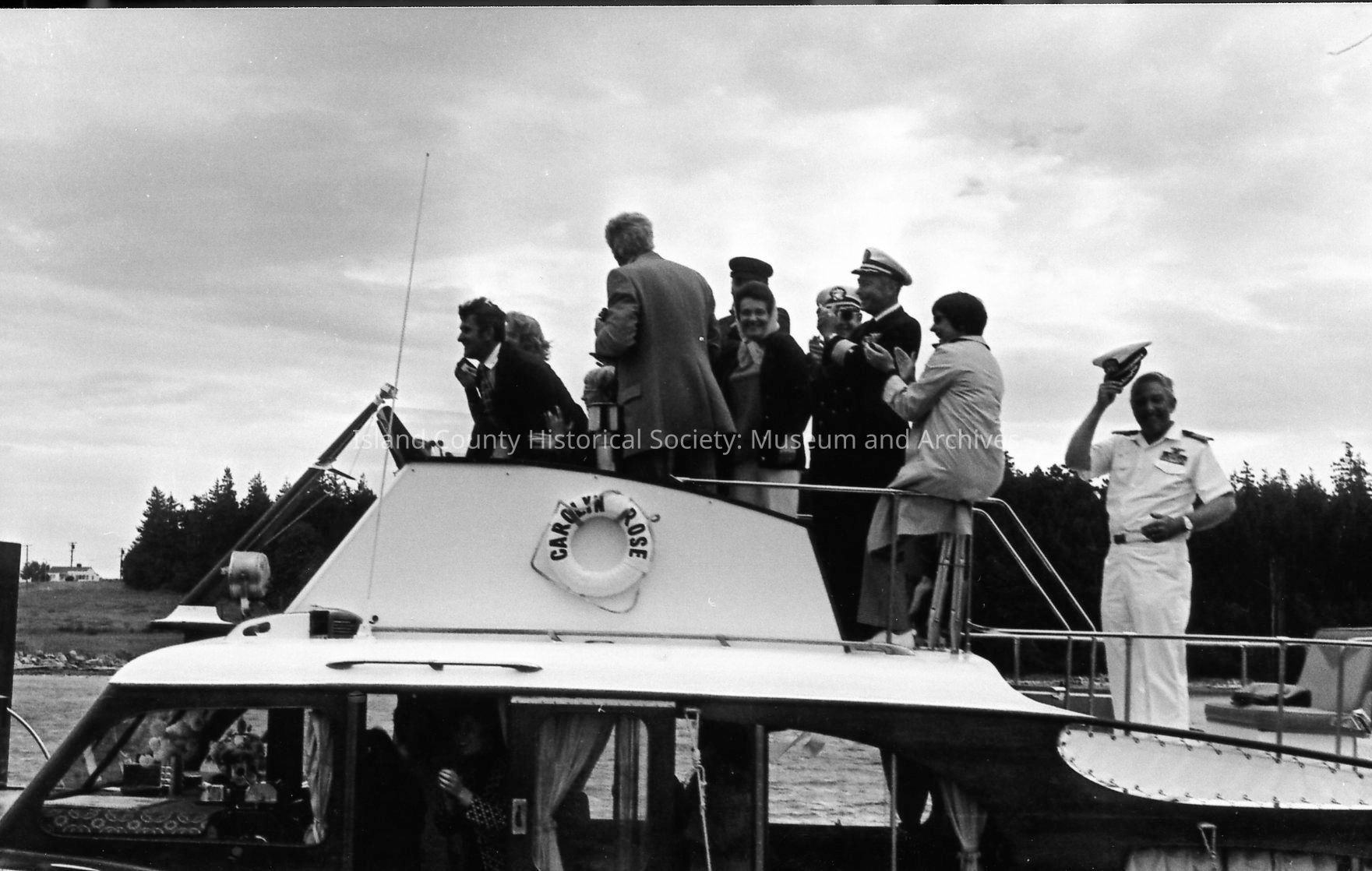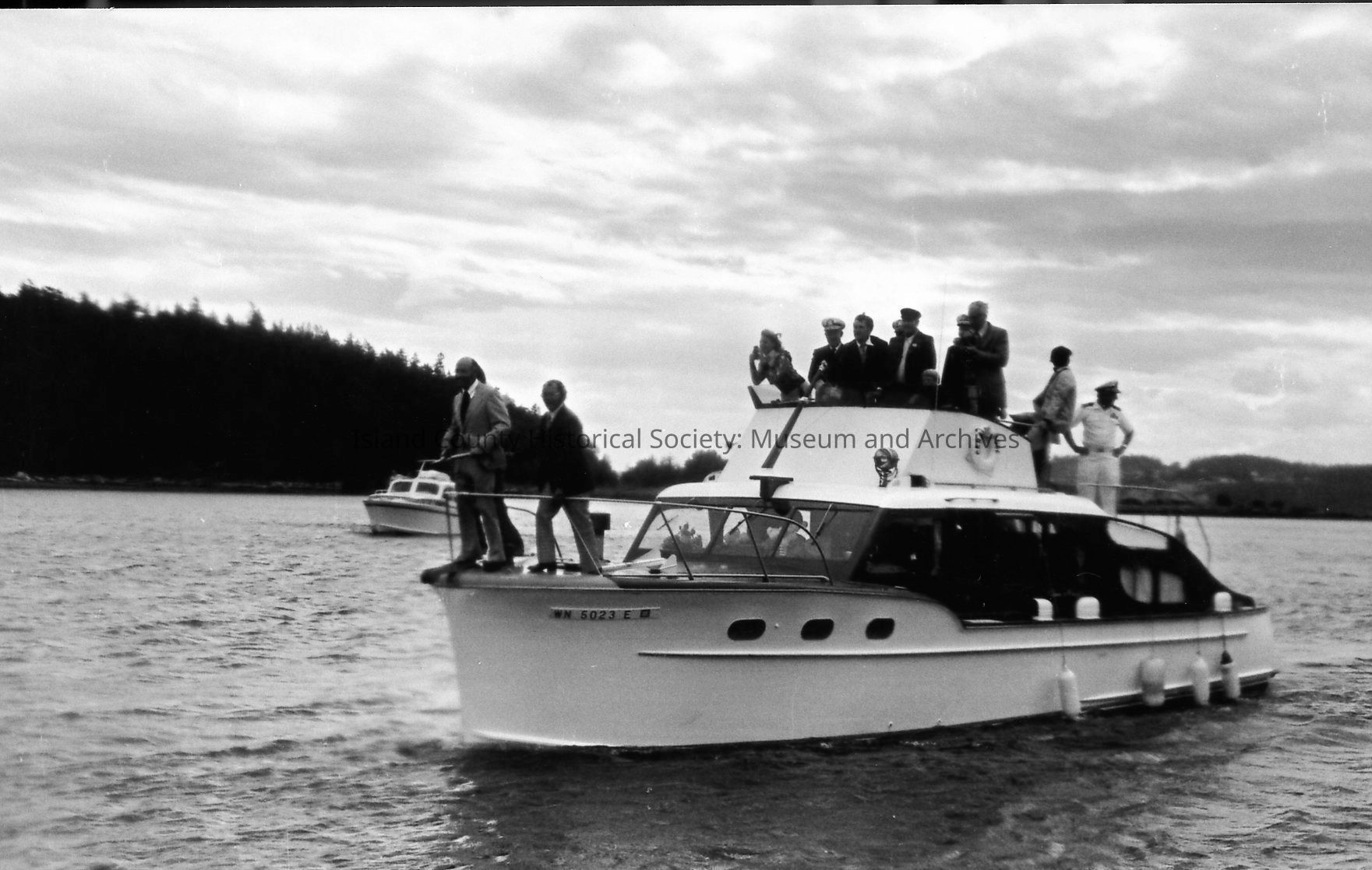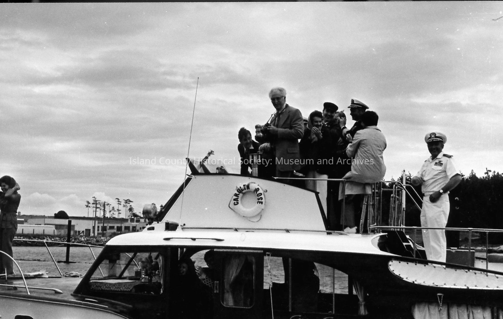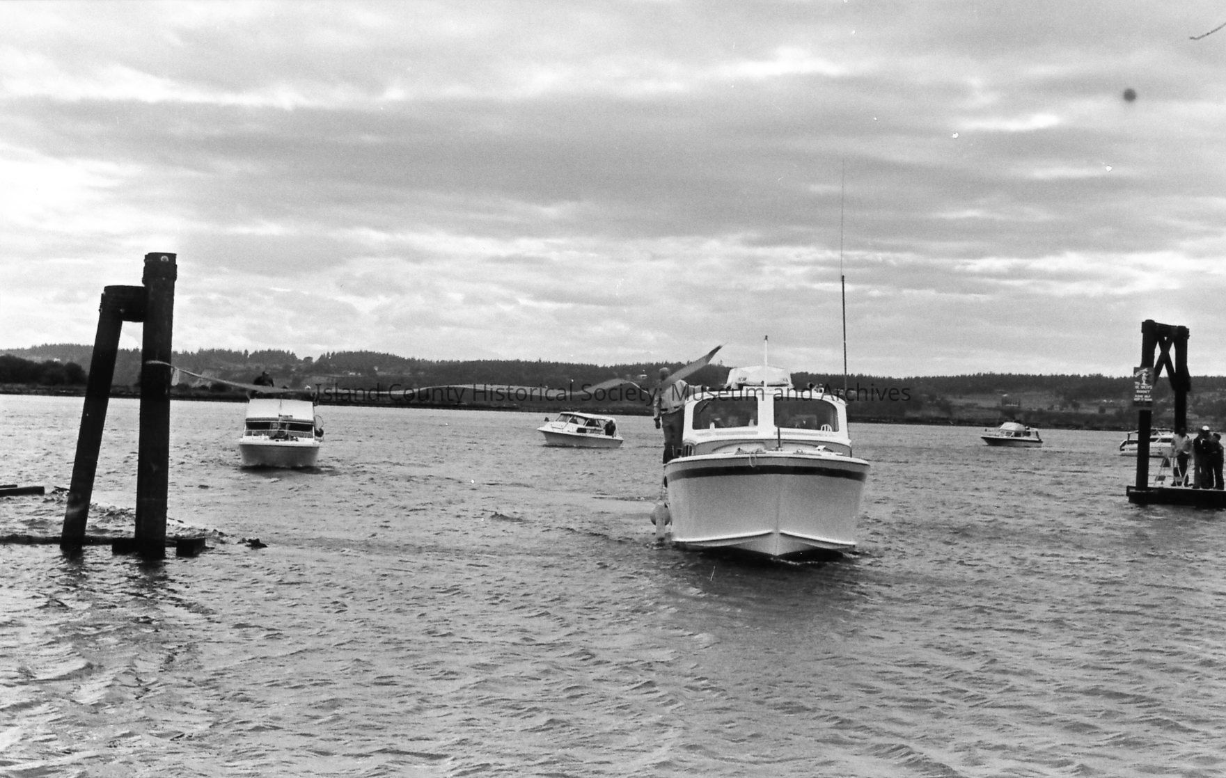 A boat approaches a long ribbon stretched between pilings at the opening of the Oak Harbor Marina in 1974. Mayor Al Koetje and Congressman Lloyd Meeds and a third person are at the bow holding a large shears, preparing to cut the ribbon.Photograph Details