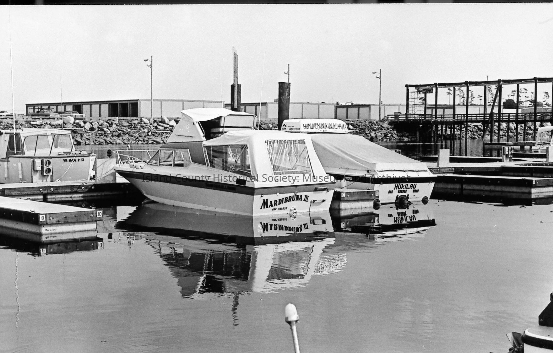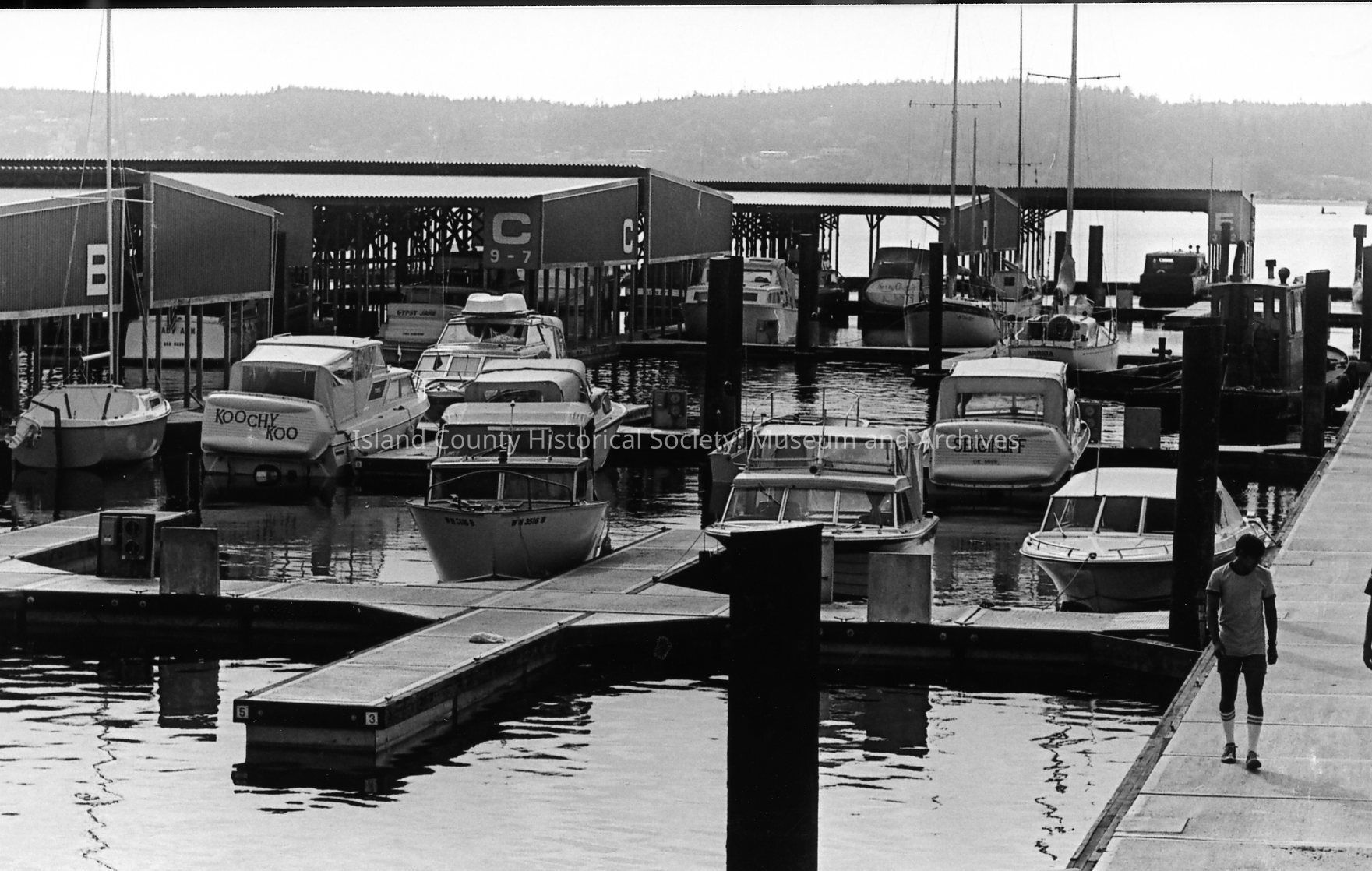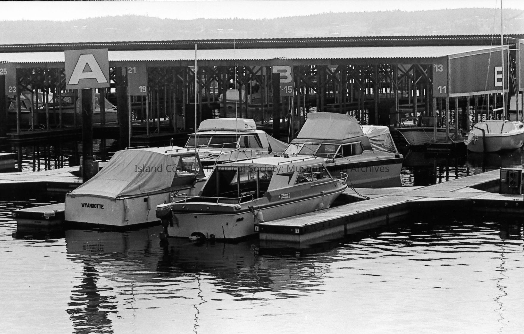Boats in slips at the opening of the Oak Harbor Marina in 1974. Some are not covered while other slips are in covered areas marked B, C, D, and E. Various views included.Photograph Details