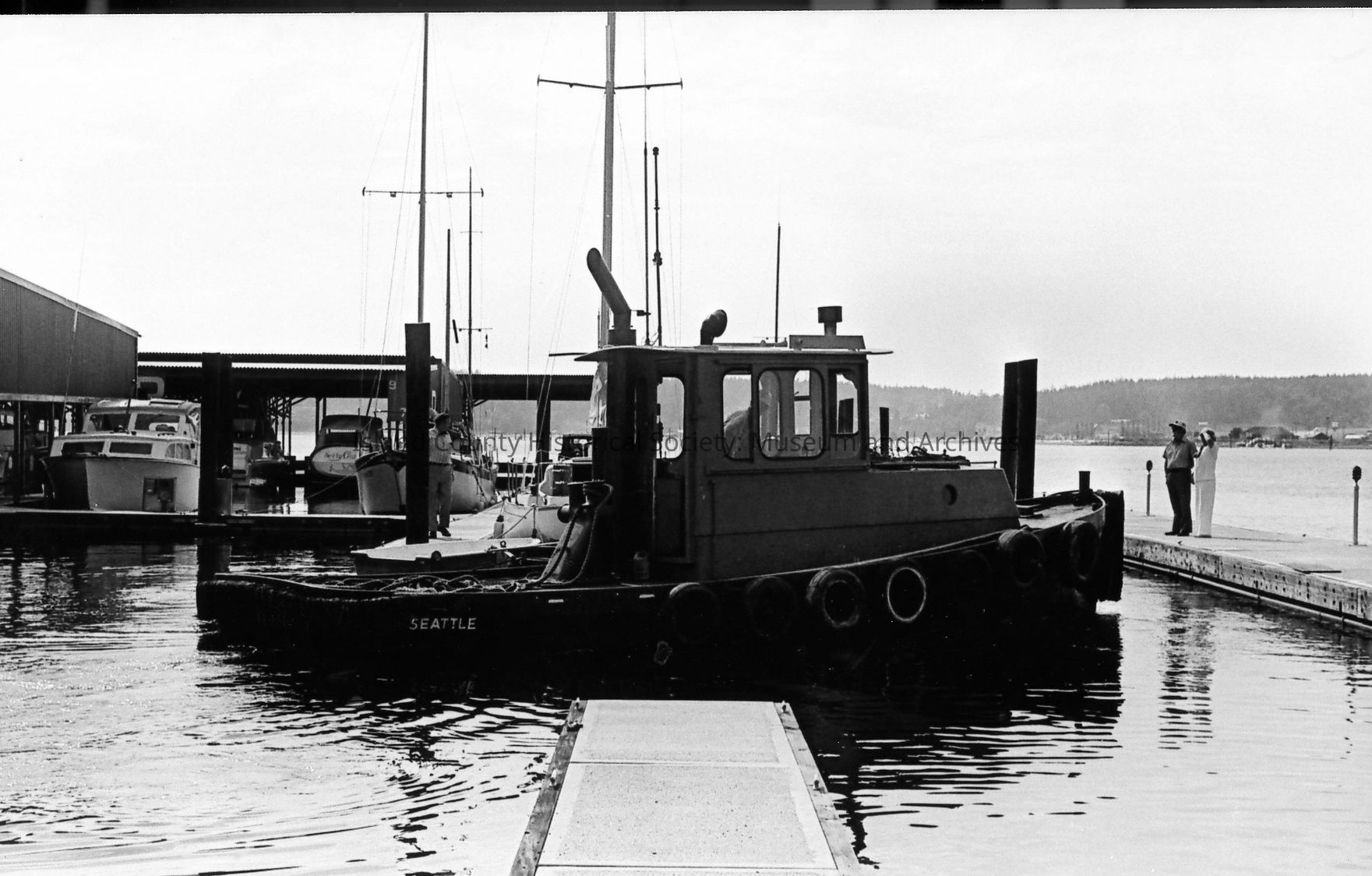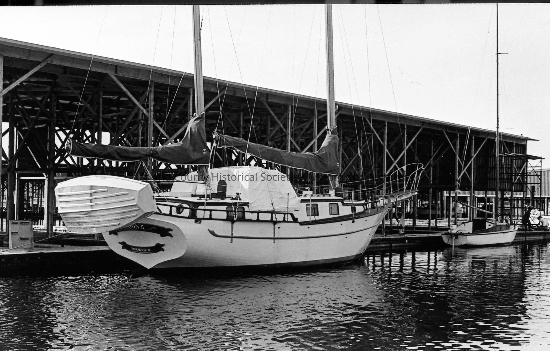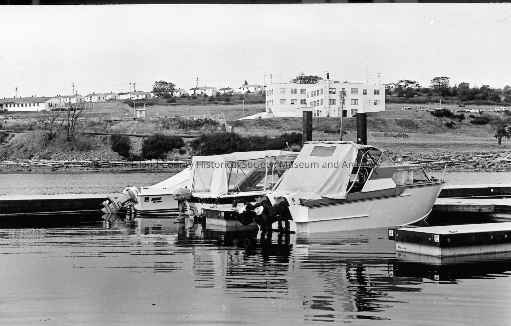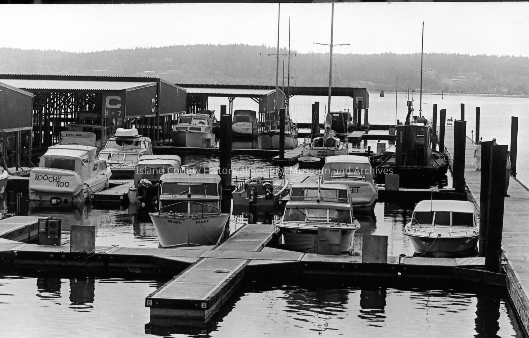 Boats in slips at the opening of the Oak Harbor Marina in 1974. Some are not covered while other slips are in covered areas marked B, C, D, and E. Various views included.Photograph Details