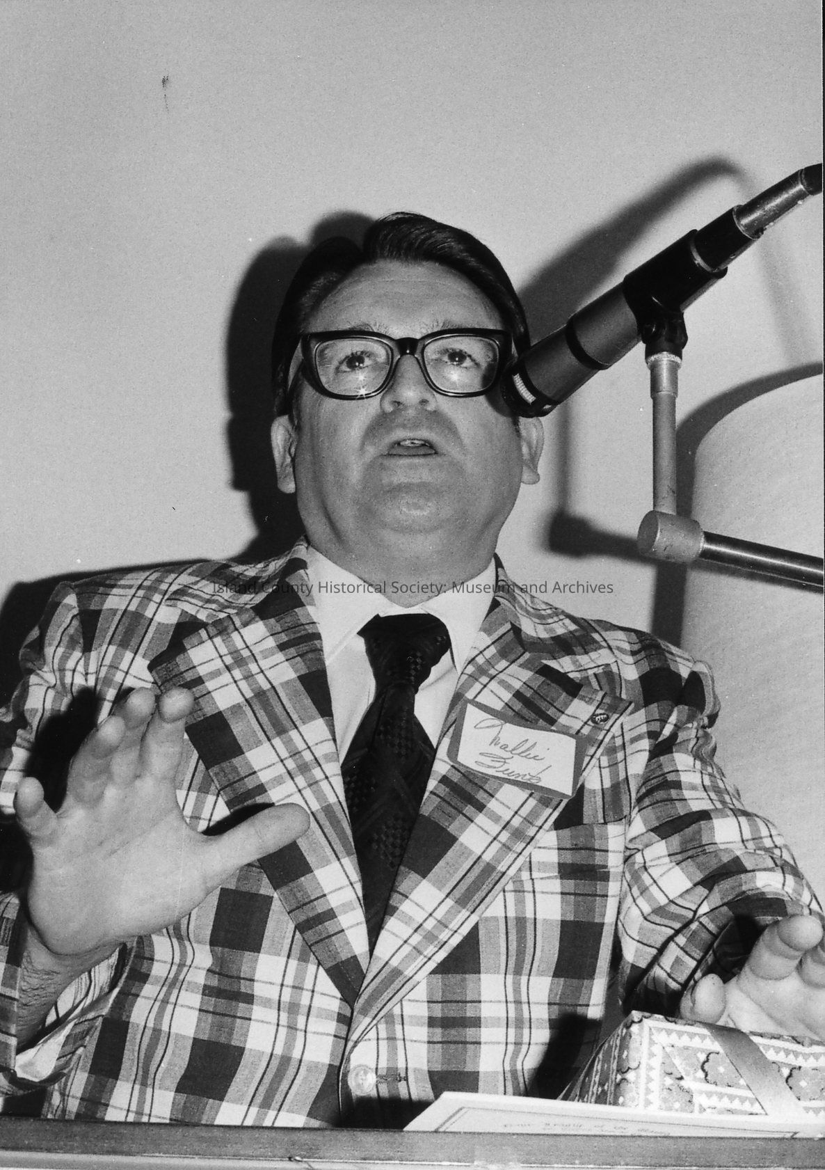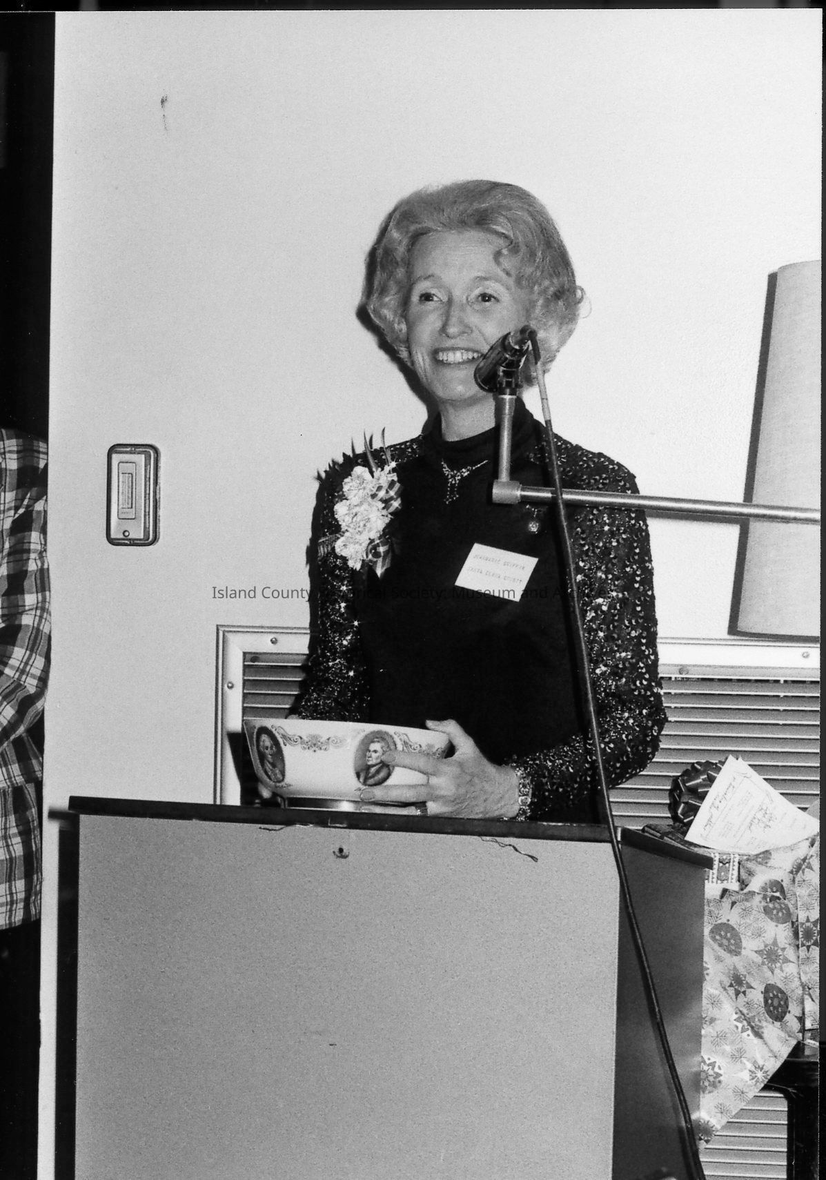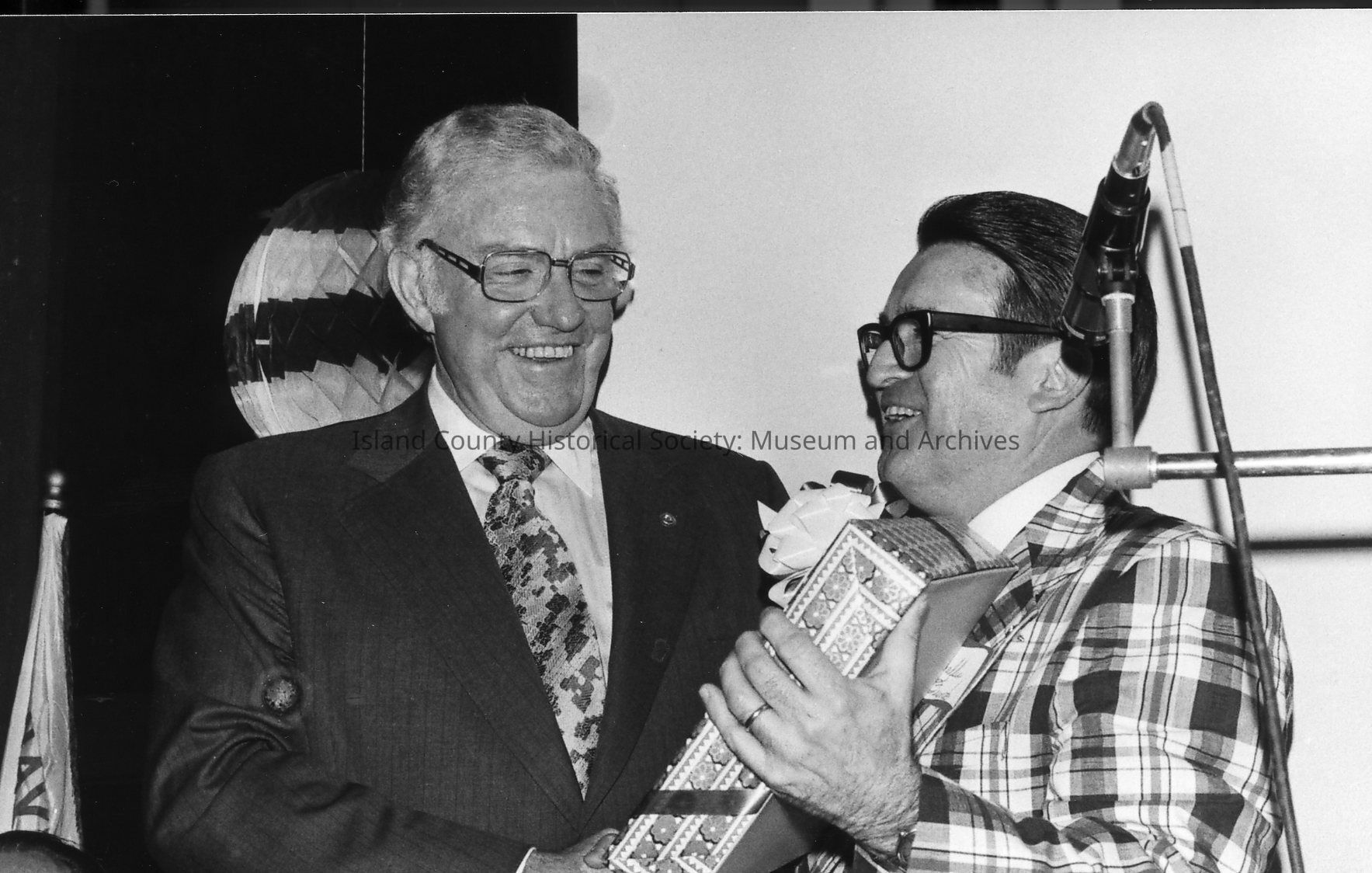 Wallie Funk and an unnamed man stand near a microphone at a Navy League dinner. They are smiling and holding a wrapped package.Photograph Details