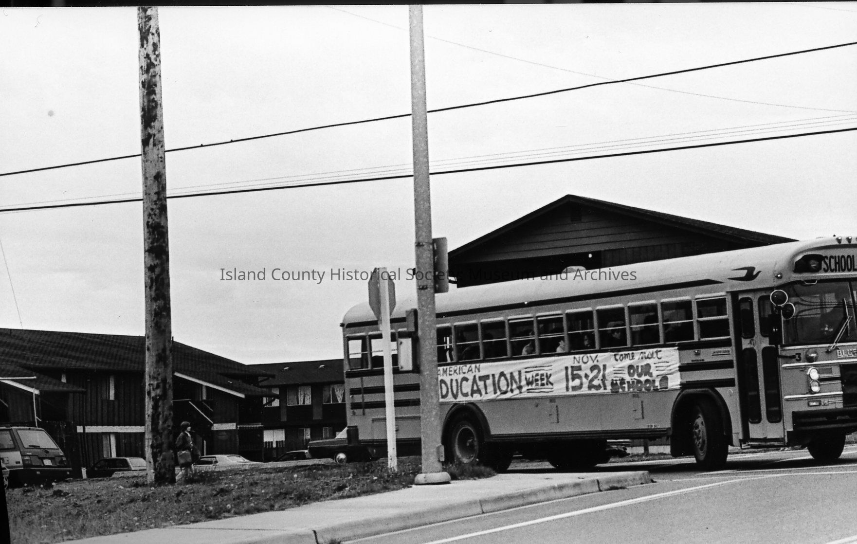 A school bus turns at a corner. On the side of the bus is a banner reading: American Education Week, Nov. 15-21, Come Visit our School. An apartment house is visible in the background.Photograph Details