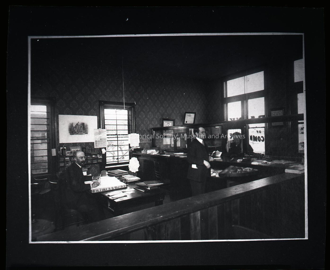 Negative of the interior of the Coupeville Bank, "Old Bank of Commerce". January 1908. One man is seated at a desk with a large ledger, another is the clerk at the till, customer on the other side of the window. Railing in foreground. Wallpaper. Large windows - one has Bank of Commerce painted on it.