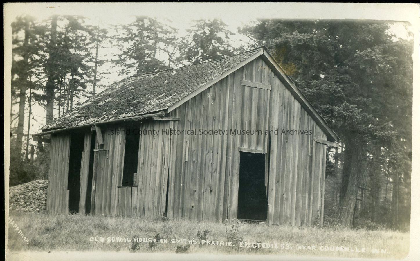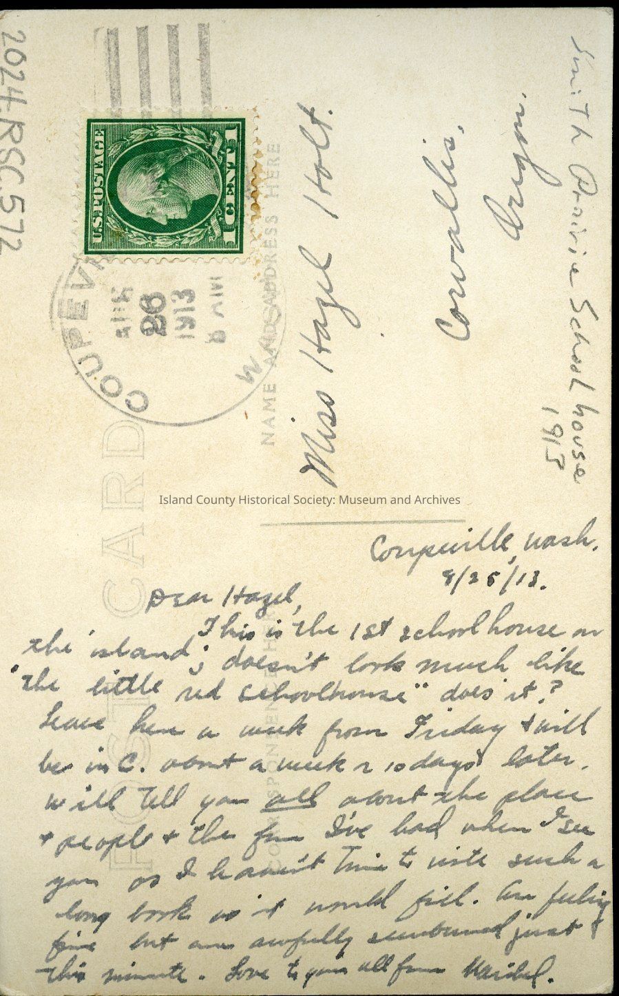 Postcard depicting an old schoolhouse, erected 1853, on Smith's Prairie near Coupeville. Postcard is addressed to Miss Hazel Holt of Corvallis, Oregon. Postmarked 26 August 1913, Coupeville.