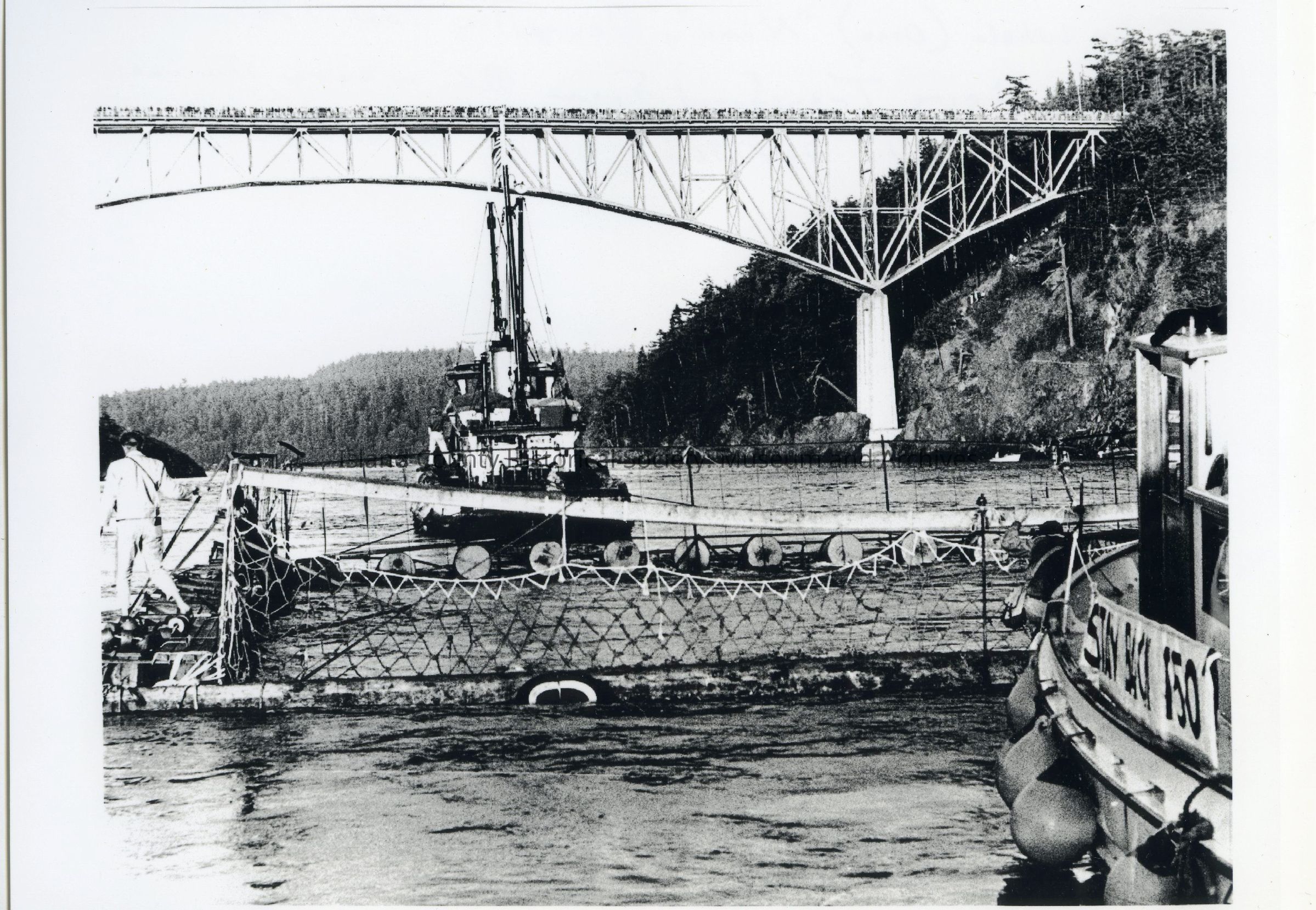 Orca "Namu" being transferred from British Columbia where he/she was captured to Seattle. Passing under Deception Pass Bridge with crowd of spectators on bridge.Photograph Details
