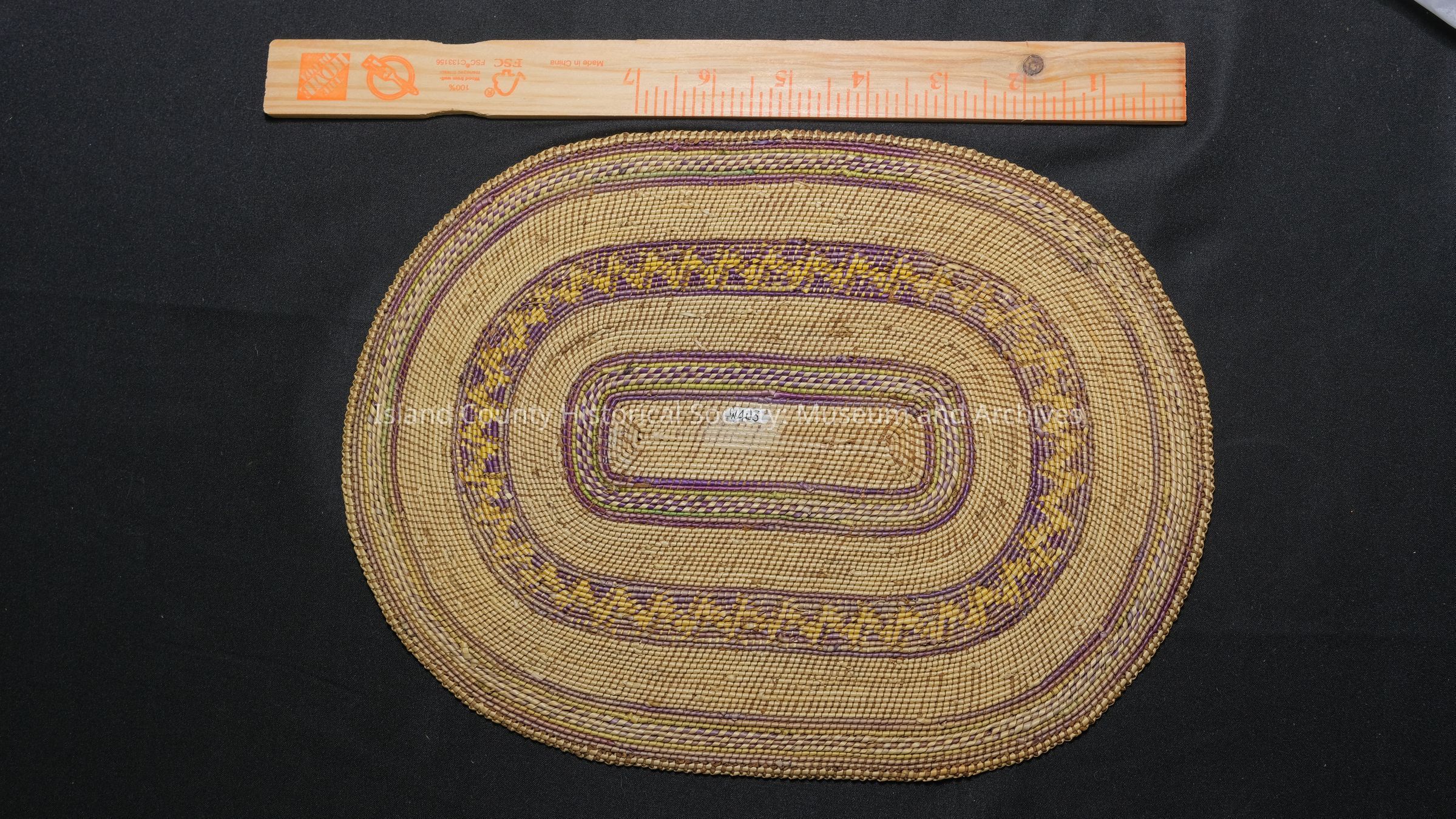 Medium oval mat, purple, green, yellow, ecru - Neah Bay area
