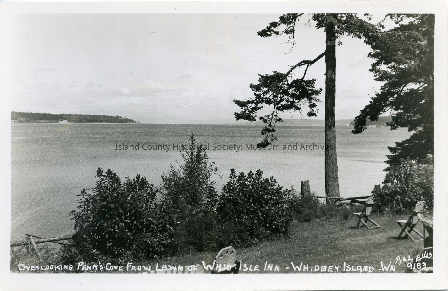 Postcard depicting the view overlooking Penn Cove from the lawn of the Captain Whidbey (Whidbey Isle) Inn, likely c. 1950s. Photo by Ellis.Collection