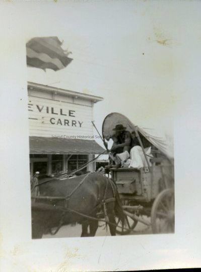 Photograph of a covered wagon pulled by horses in a Penn Cove Water Festival parade, likely c. 1940s.Photograph Details