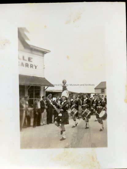 Photograph of a band performing and marching in a parade at the Penn Cove Water Festival. Coupeville Cash & Carry storefront is partially visible in the background. Likely c. 1940s.Photograph Details