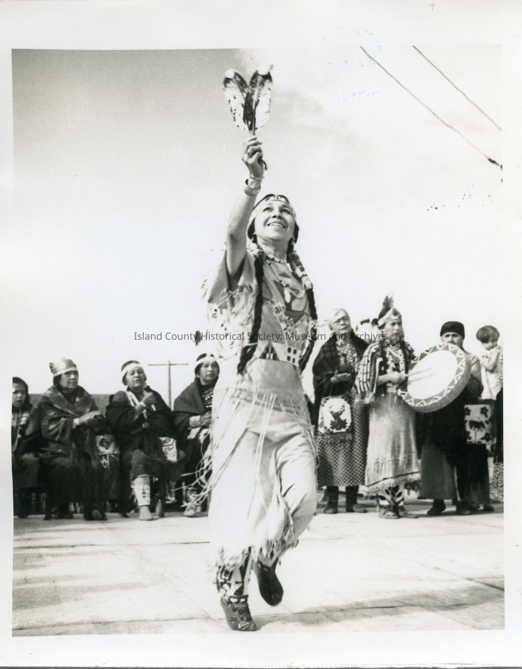 Photograph of an Indigenous woman performing a dance at the Penn Cove Water Festival, c. 1930s. The woman is clothed in "traditional" regalia and is holding aloft two feathers from a large bird, possibly an eagle, owl, or hawk. She is encircled by seated and standing Indigenous peoples (including children), some of which are drumming. It is unclear which tribe{s) these peoples are associated.