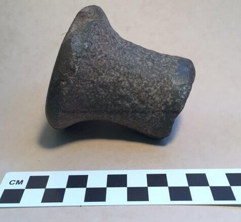 Native American stone pestle. Part of the top (handle) is broken off and the base is chipped. Wear is evident on bottom of base of object - smoothing and pecking marks. This object was found on a beach in Oak Harbor.