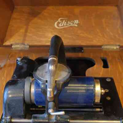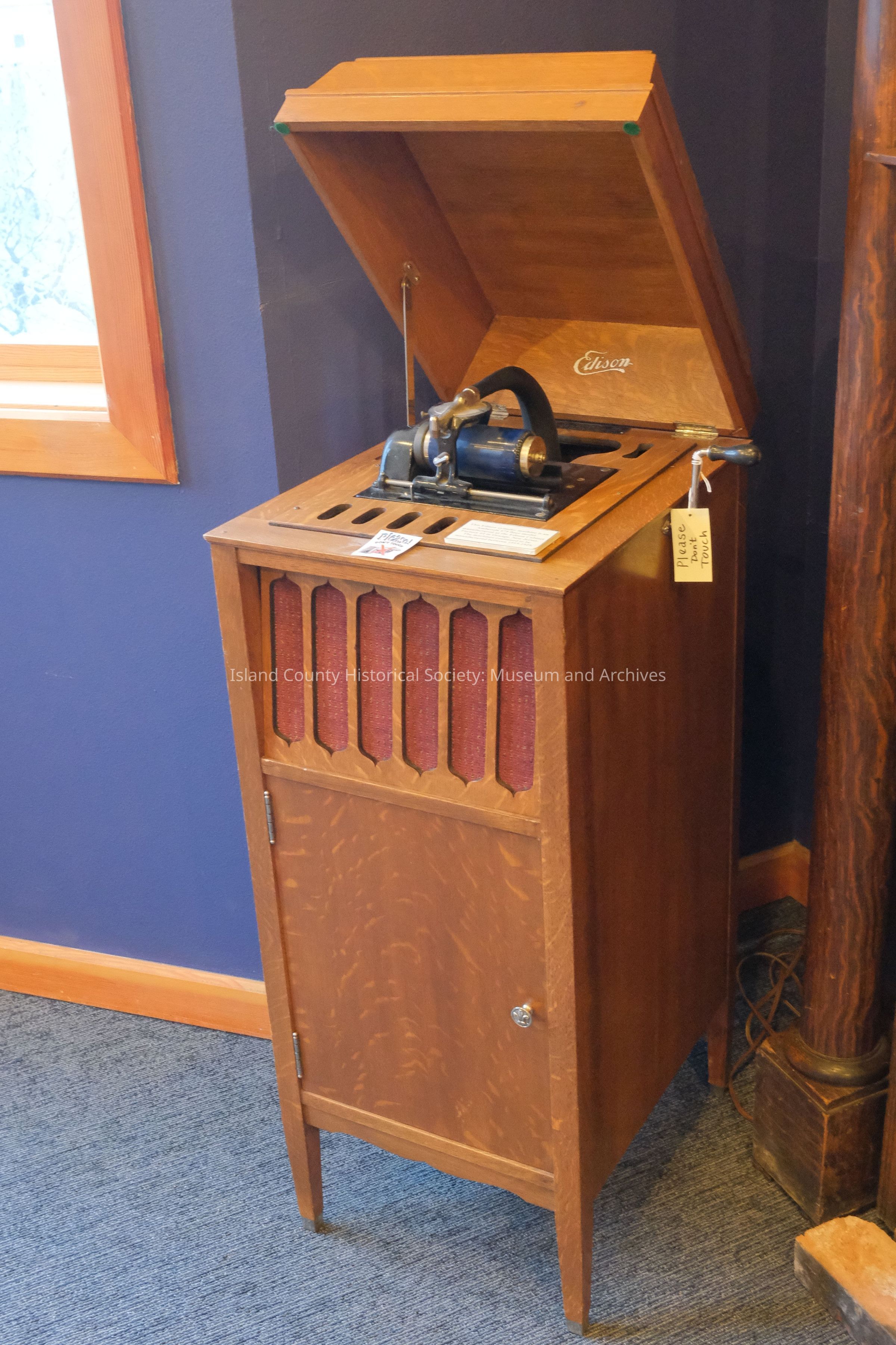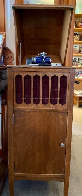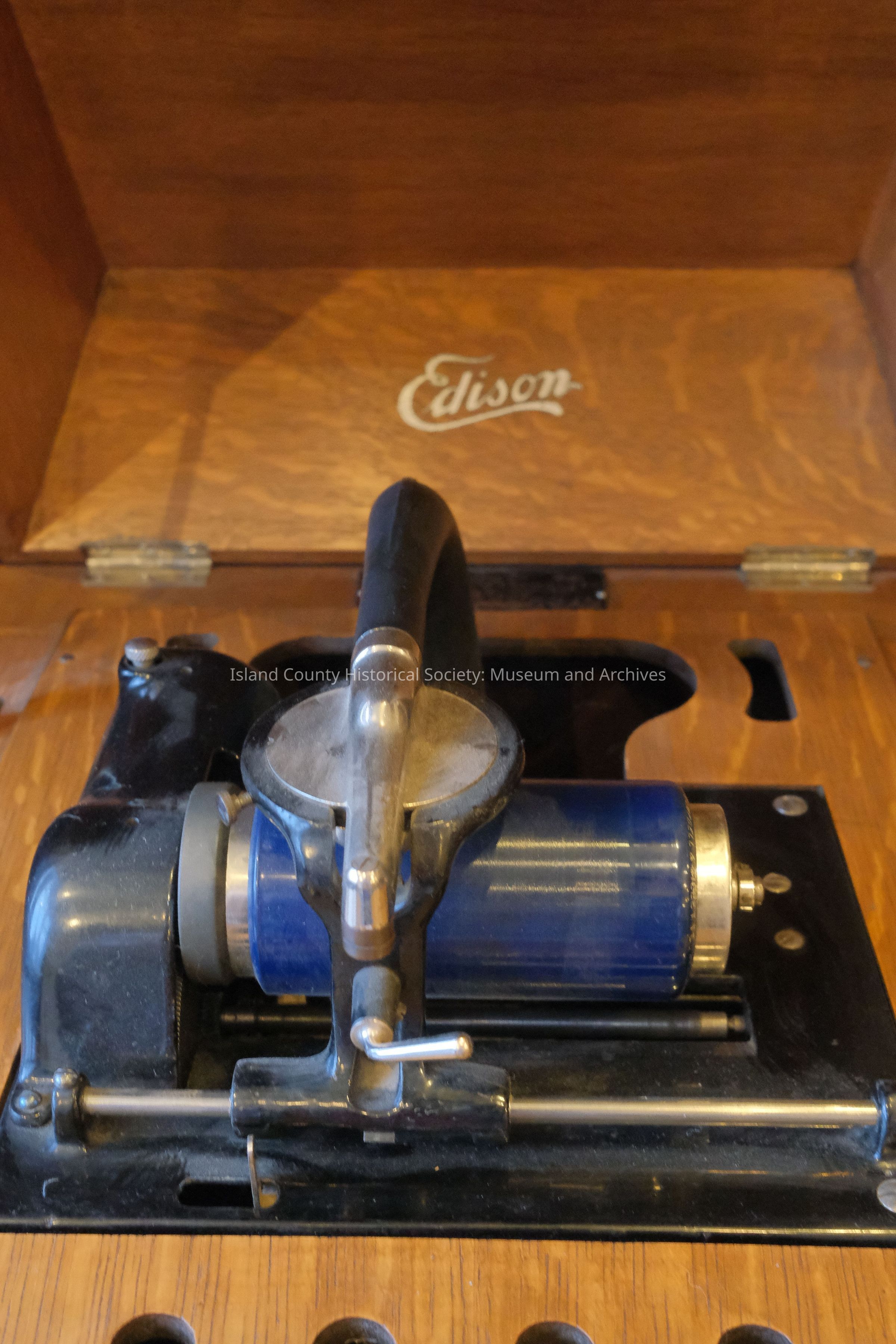 Edison upright phonograph, 3 drawers, 7 cylinder records, handle for winding.Collection