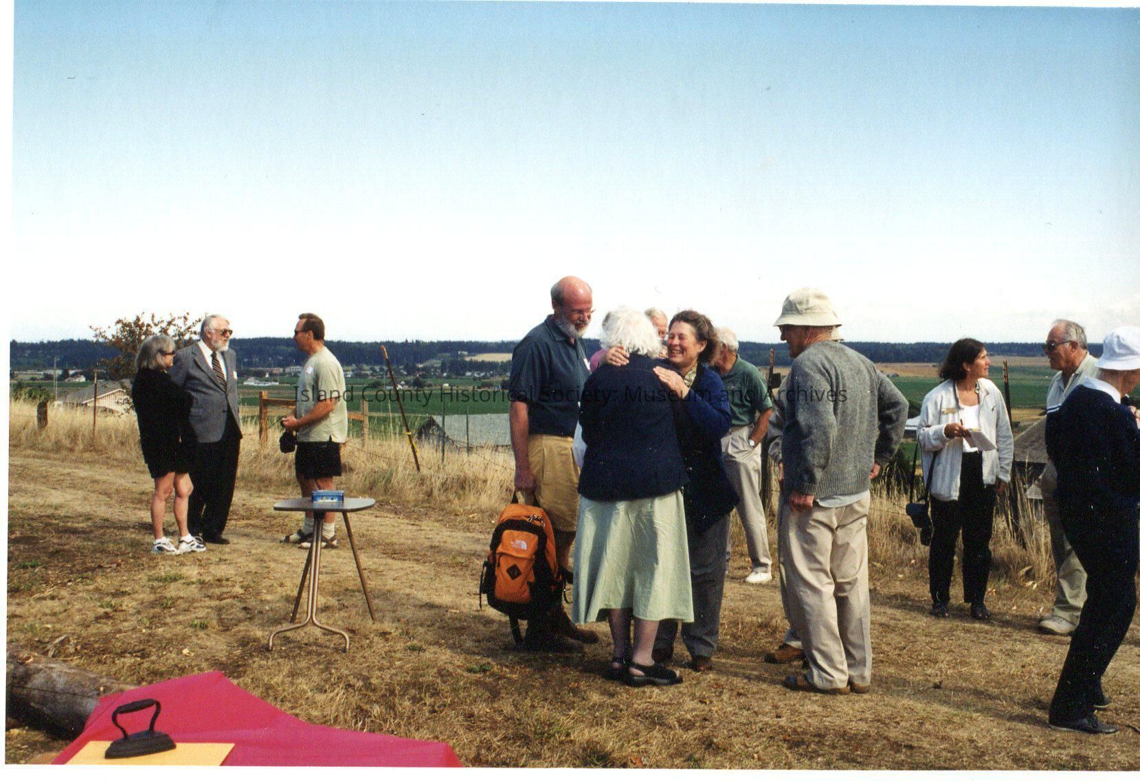 Albert Heath Gathering September 5th 2002 out on Ebey's Prairie. Several people broken into smaller groups, standing and chatting. Albert Heath is not in the photo. In the centre of the picture, a aman in fishing hat and grey sweater on the right. He looks at two women embracing. Penn Cove behind them in the distance, clear blue sky, red material with black iron on top of it in right hand bottom corner.