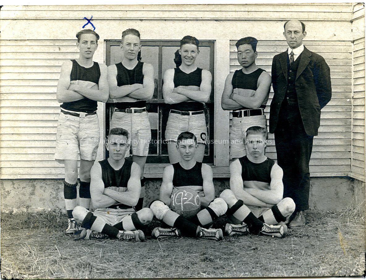 Coupeville Basketball team featuring Charles Lyon Jr standing farthest left. 1920 (x over his head)