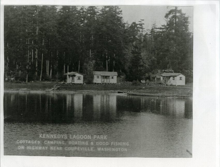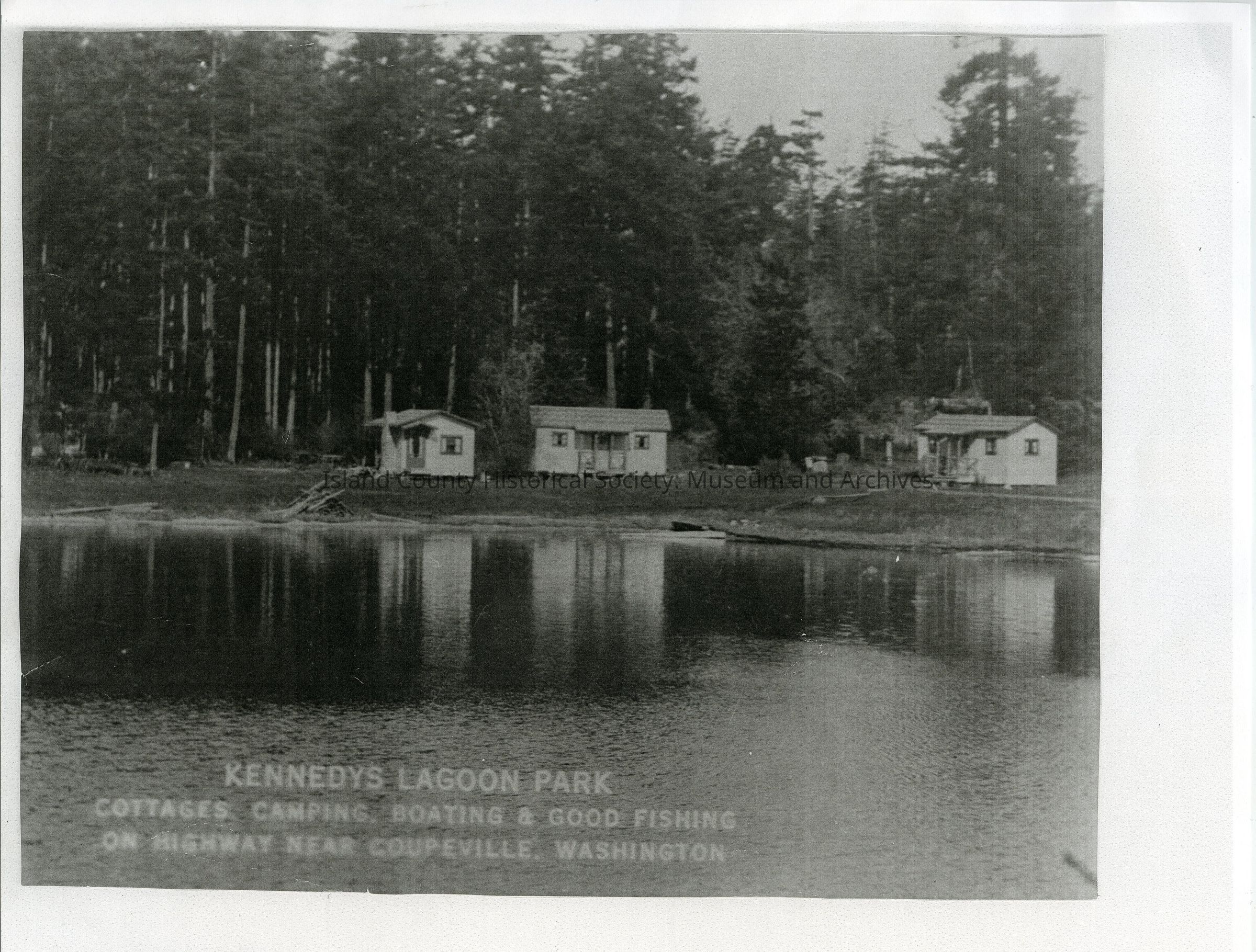 Photocopy of a group of small cabins along a shore with driftwood. Trees in the background. Caption: Kennedys Lagoon Park, Cottages, Camping, Boating & Good Fishing, on Highway Near Coupeville, Washington From the folder: Kennedy's Lagoon