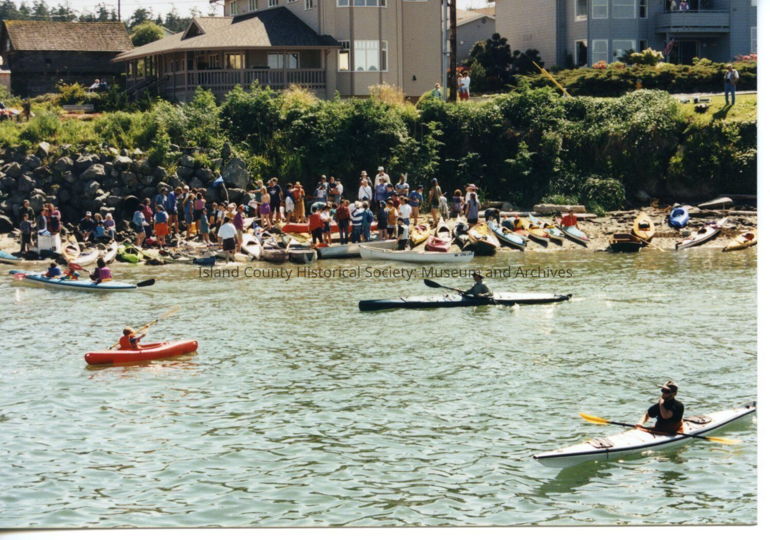 Coupeville Water Festival, 1995. Color photo. View from the wharf looking back toward the beach and ICHS museum. Numerous kayaks of many shapes & colors are pulled up on the beach. The paddlers and spectators are standing around the boats. Four kayakers are paddling in the water.Collection