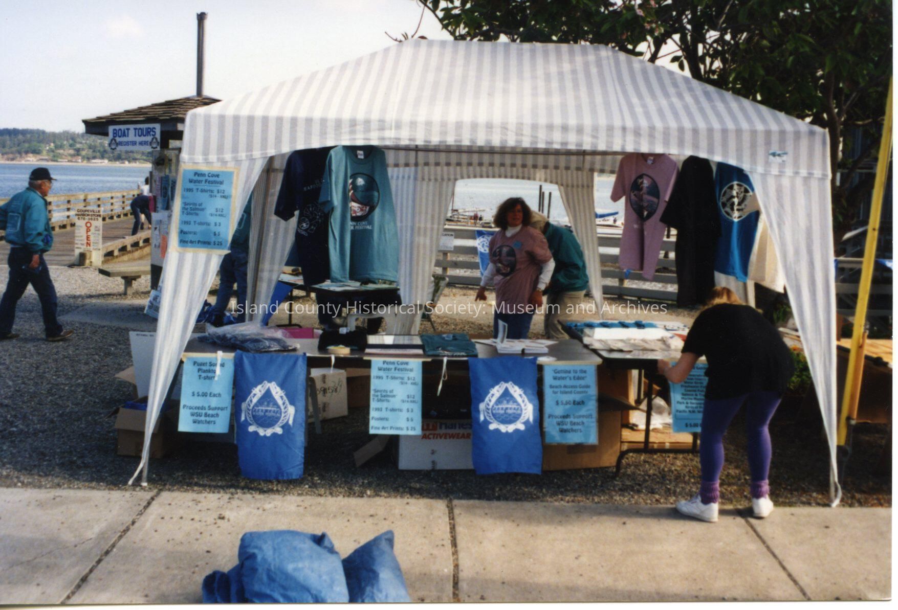 Coupeville Water Festival, 1995. Color photo. Gray & white striped festival information tent. There are several blue signs and recycling banners displayed as well as books and t-shirts. A brown haired woman wearing a pink t-shirt is manning the booth. Another woman in purple leggings and a black t-shirt is bending over a table reading a sign. The tent is situated at the beginning of the wharf.Collection