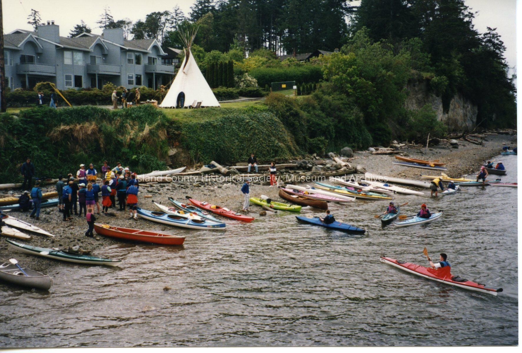 Coupeville Water Festival, 1995. Color photo. View from the wharf looking back toward the beach and the blue condos. A tepee is standing on the grassy area above the beach and in front of the condos. Numerous kayaks of many shapes & colors are pulled up on the beach. The paddlers and spectators are standing around the boats. Four kayakers are paddling near the beach.Collection