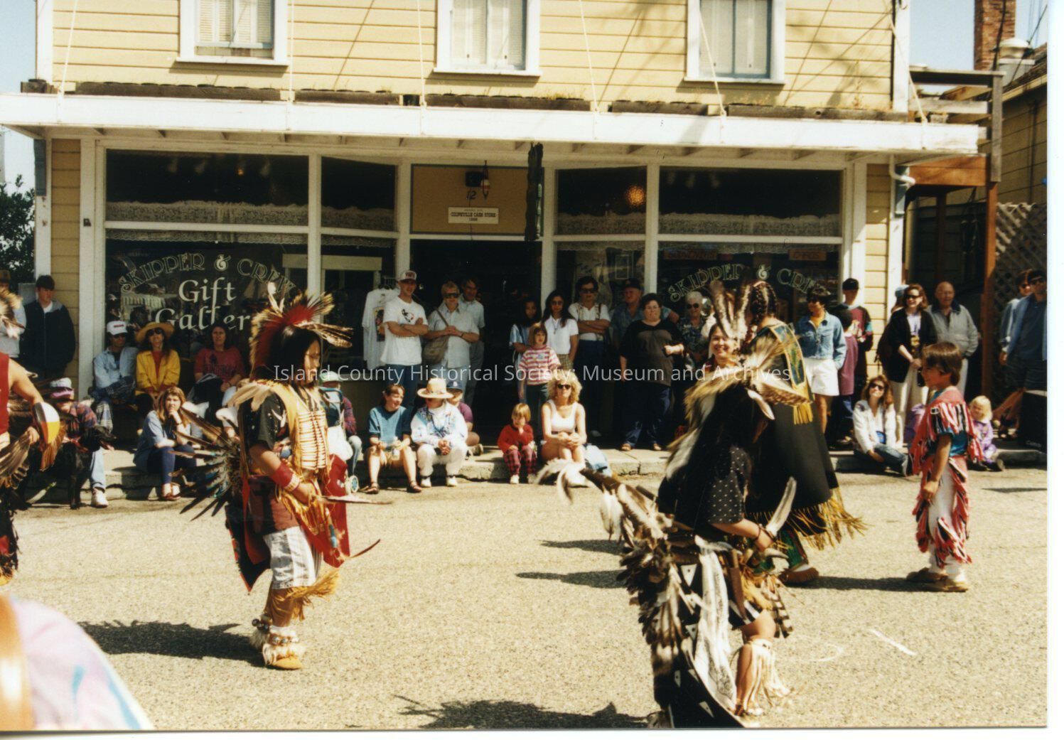 Coupeville Water Festival, 1995. Color photo. View of several young Native American girls & boys in ceremonial costumes dancing at the festival. Spectators are standing in the background in front of #12 Front Street, The Coupeville Cash Store 1886. This picture is related to 2017.067.009 through 2017.067.013.Collection