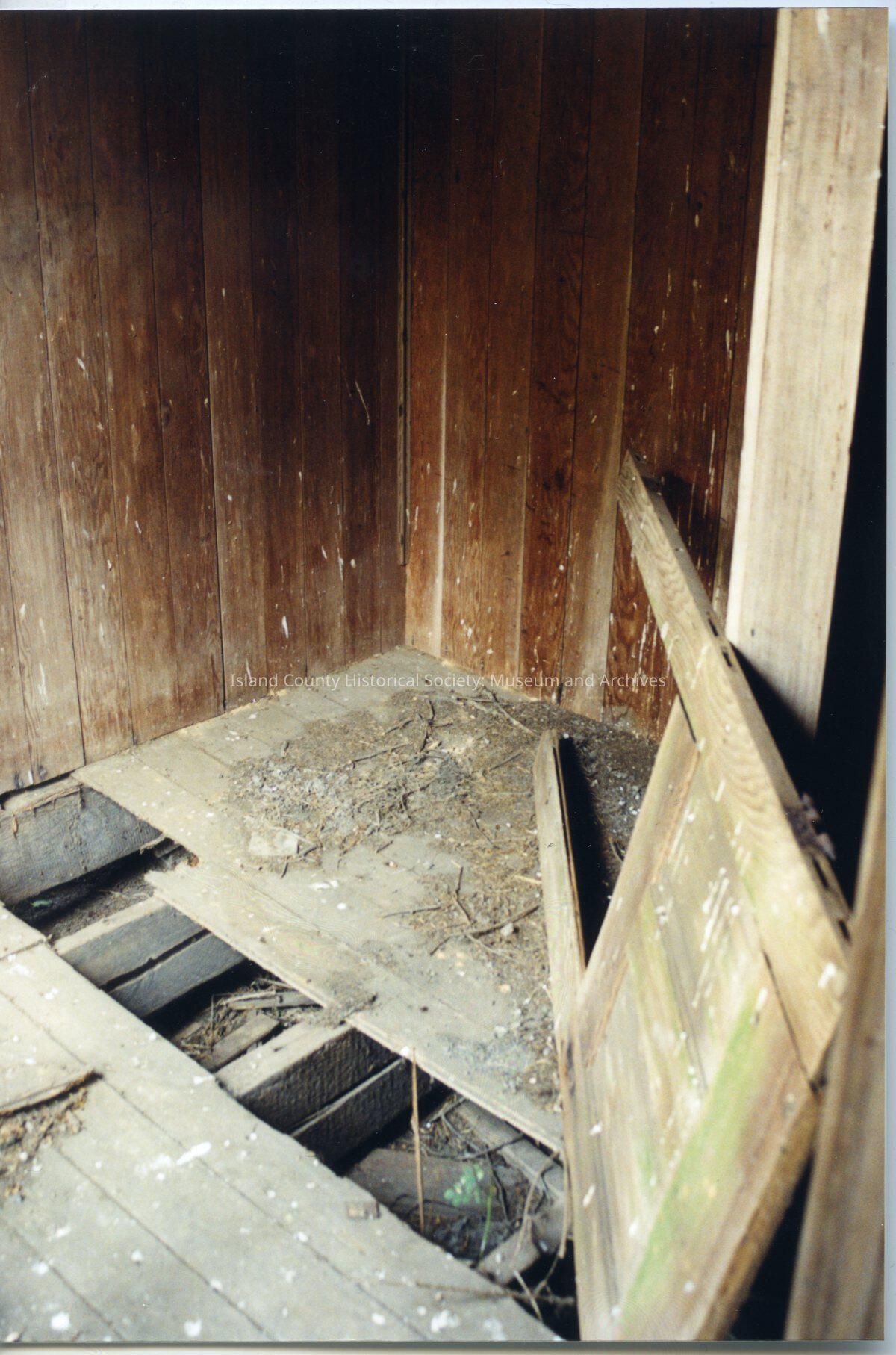 Ralph Engle Farm. Between Hill Road and Ebey's Landing Road. Inside of the structure - floor torn up, joists visible, bits of twigs or other items on the floor. Wall panels are verticle.