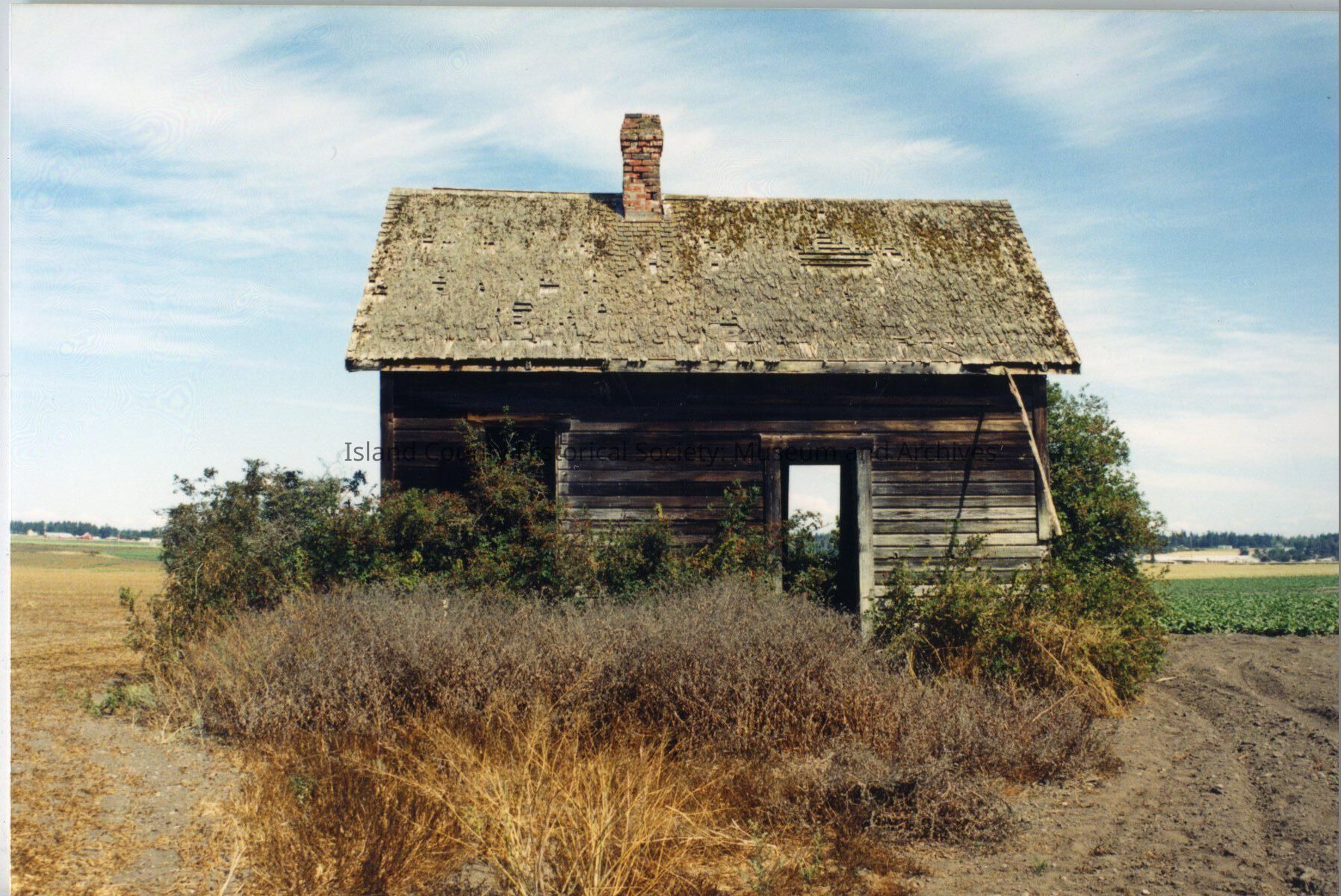 Ralph Engle Farm. Between Hill Road and Ebey's Landing Road. View of the house from the front - doorway off-center, can see through via a window to the other side. Bushes are along the house under and around the windows and doors. A chimney is still on the roof - bricks.