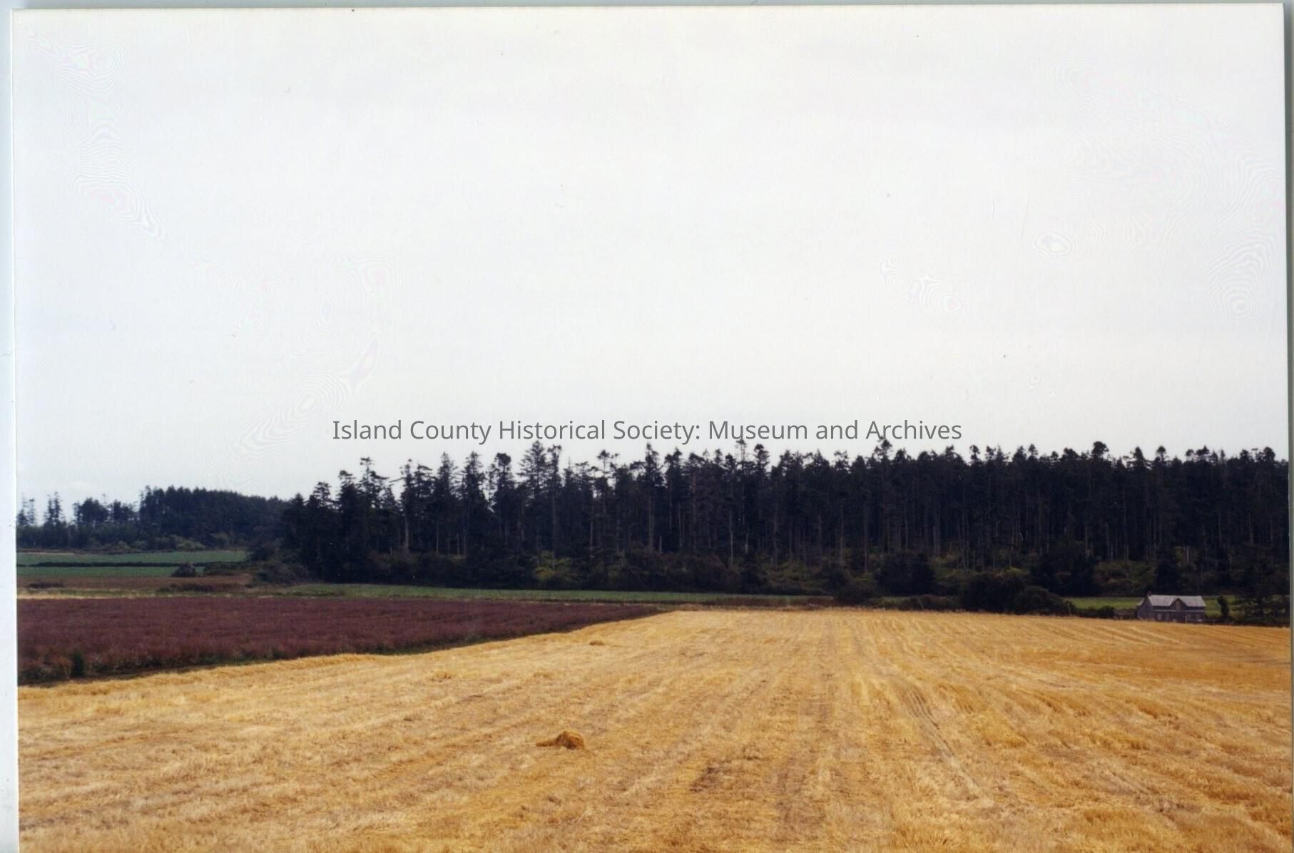 Ralph Engle Farm. Between Hill Road and Ebey's Landing Road. Outside view from the structure to the trees and hill and farmland in between.