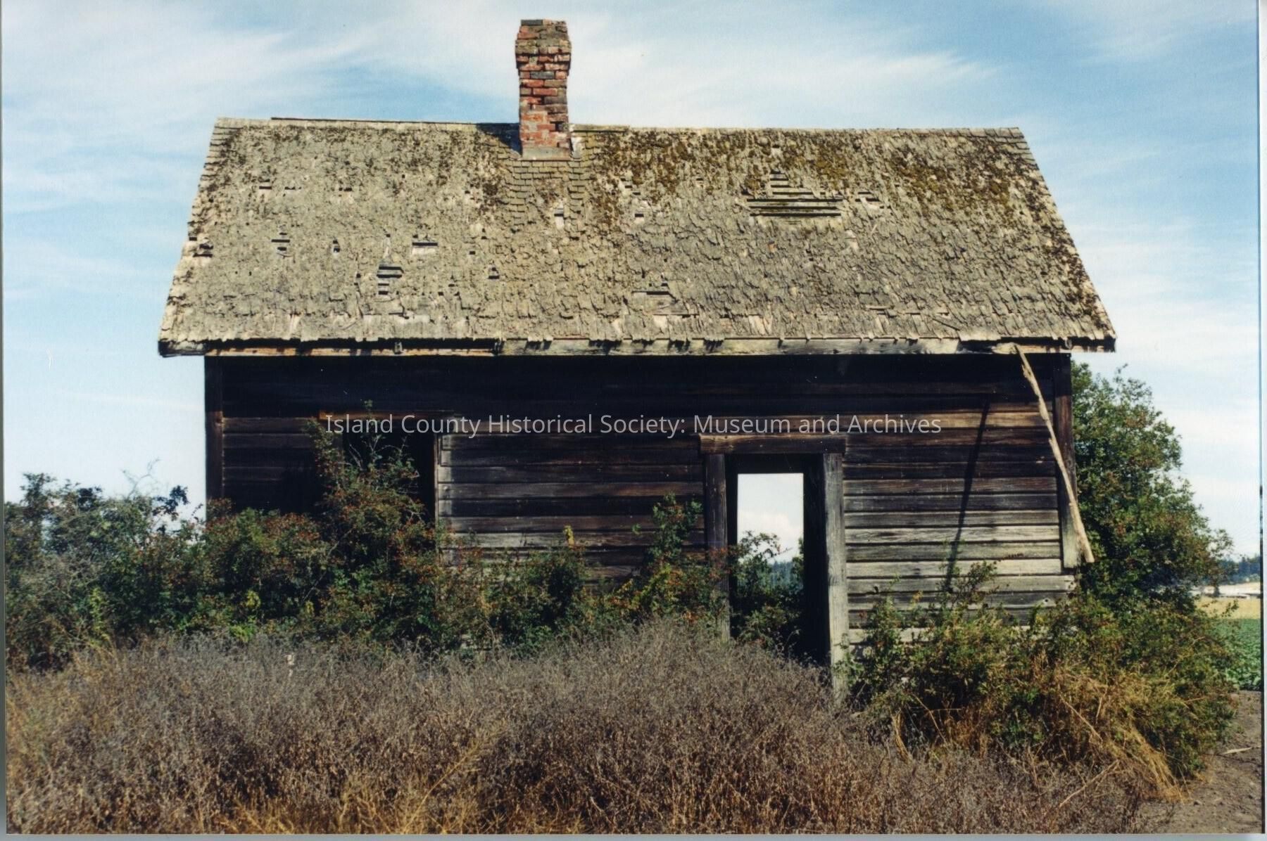 Vernacular Farmhouse. Wood frame set on post and block foundation; rectangle (12' x 16'); 2 bays wide; 1 1/2-stories; shiplap siding; wood-shingled gable roof with extended eaves; off-center entrance with plain surrounds on south facade; corbelled center chimney. Exterior features include boxed cornice; corner boards; sash with plain surrounds (muntins removed). Notable landscape features include a wood frame, board and batten chicken coop; barn frame remnants; wood frame, board and batten gable-roofed grainery on south side of Ebey's Landing Road.