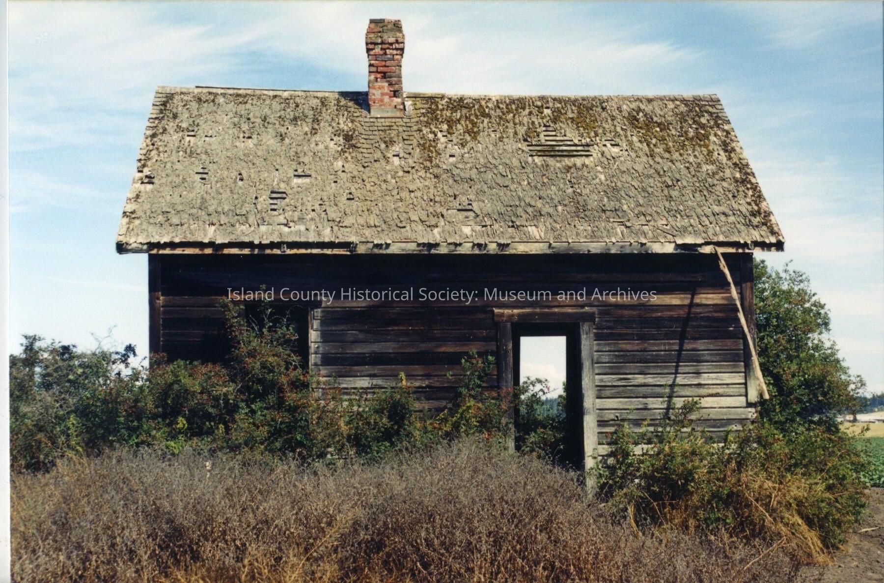 Vernacular Farmhouse. Wood frame set on post and block foundation; rectangle (12' x 16'); 2 bays wide; 1 1/2-stories; shiplap siding; wood-shingled gable roof with extended eaves; off-center entrance with plain surrounds on south facade; corbelled center chimney. Exterior features include boxed cornice; corner boards; sash with plain surrounds (muntins removed). Notable landscape features include a wood frame, board and batten chicken coop; barn frame remnants; wood frame, board and batten gable-roofed grainery on south side of Ebey's Landing Road.