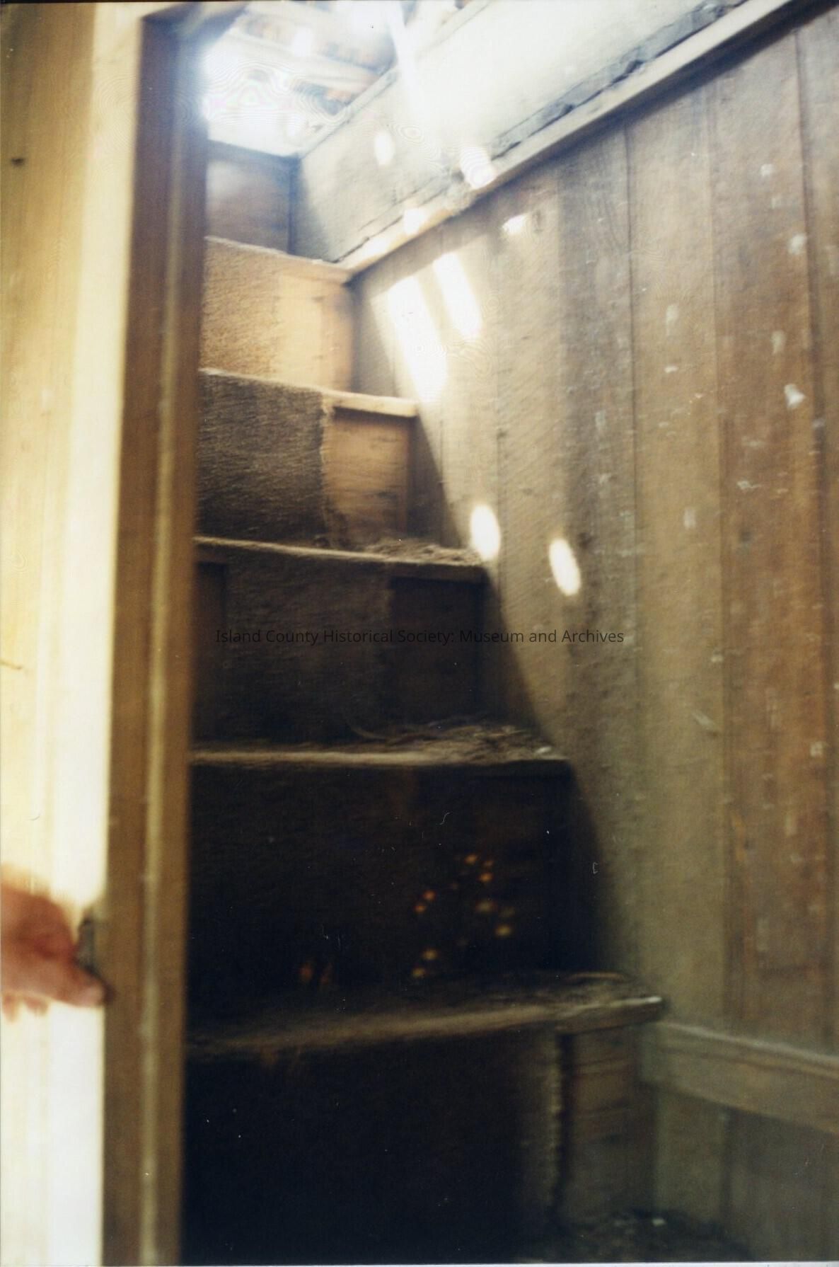 Ralph Engle Farm. Between Hill Road and Ebey's Landing Road. Photo of the inside stairway to the second level. Very steep and narrow depth. Debris on the stairs.