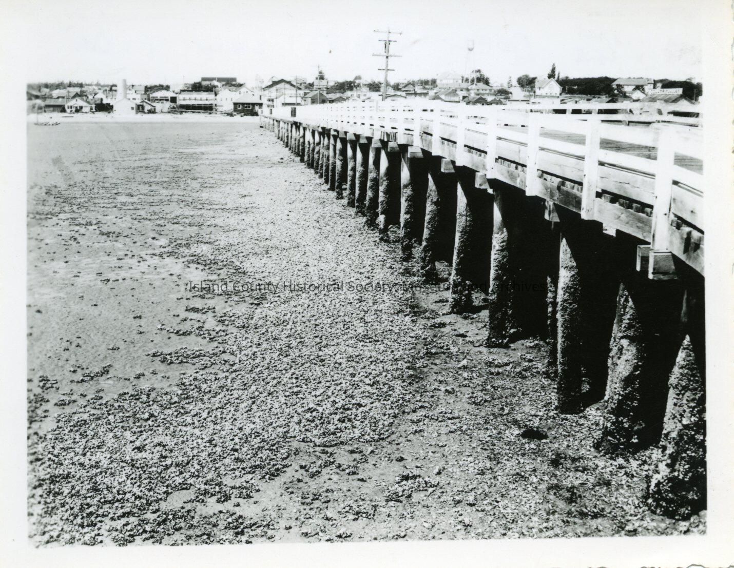 Low tide in Oak Harbor. The image is taken near the end of the old Maylor dock looking back towards town. The harbor floor is covered with muscles and barnacles. The dock railing is painted white. There are telephone poles that extend onto the dock. The back of the photo reads, "The Dock at Low Tide, Oak Harbor, June 17, 1951."Made/Created