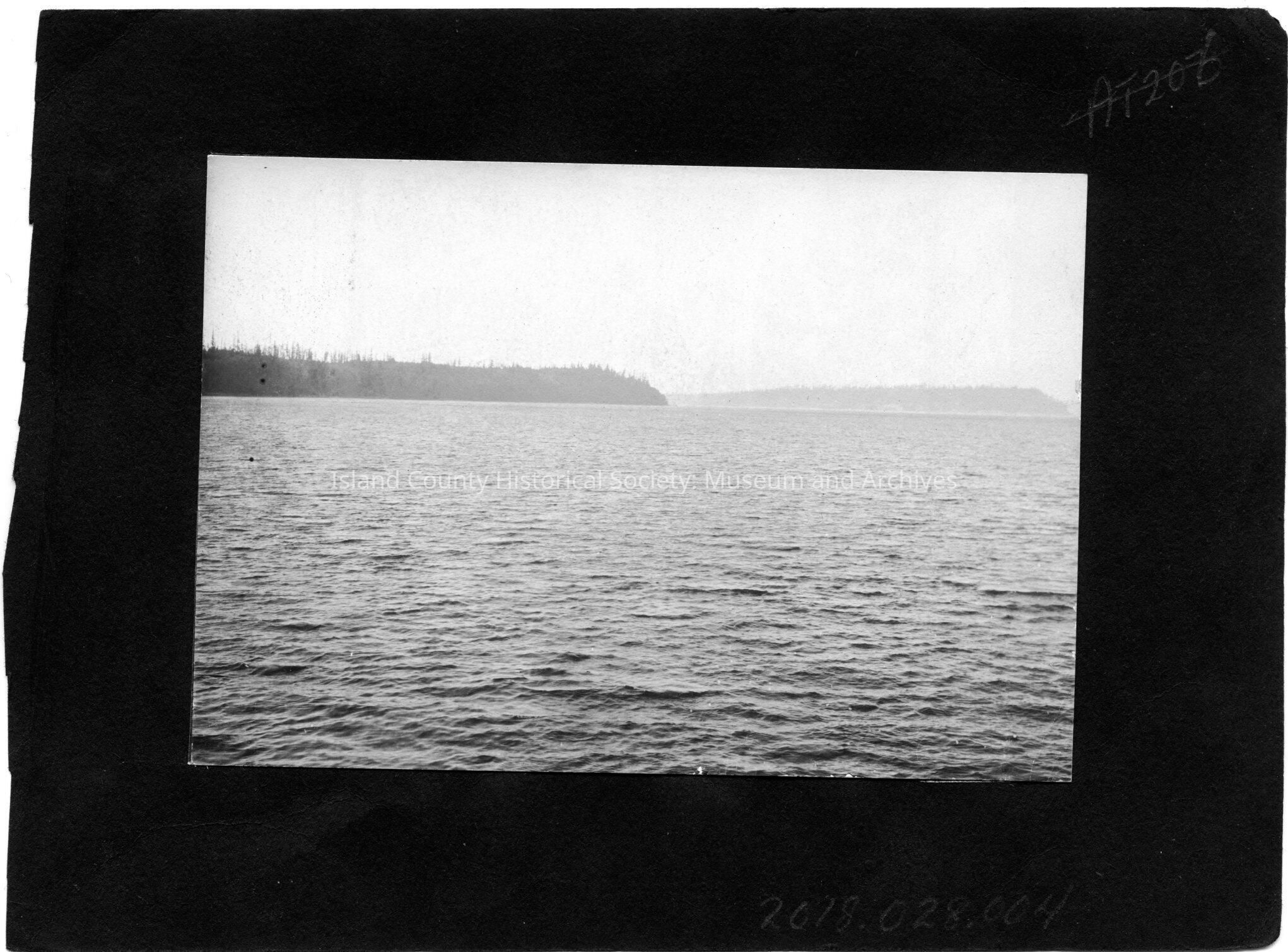 Black and white photograph. Penn Cove. Water with shorelines in background. 4.25" X 3.25" mounted on scrapbook page.