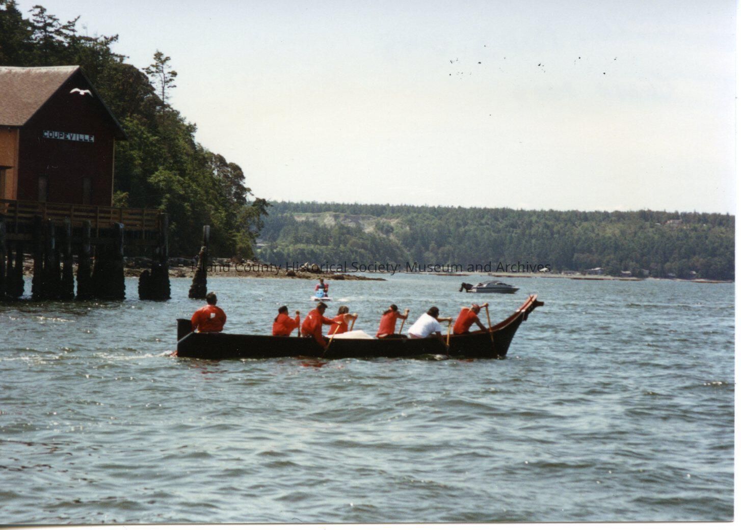 Native American Coupeville Water Festival. Color photograph. Canoe races. Canoe is going past the Coupeville Wharf. Seven men and women are paddling a large canoe similar to a dragon boat - there is a high part to the back of the canoe and a prow on the front of the canoe. Six of the crew are wearing red shirts or jackets. A jet ski and motorboat are in the background for safety during the races.
