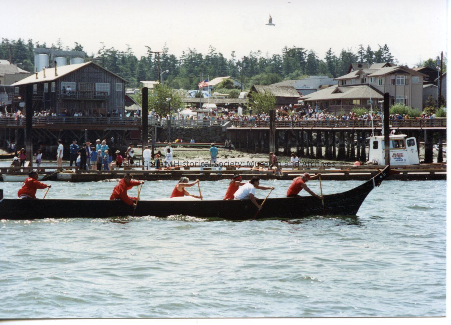 Native American Coupeville Water Festival. Color photograph. Canoe races. Canoe is going past the the old livery building towards the wharf. Six men and women are paddling a large canoe similar to a dragon boat - there is a high part to the back of the canoe and a prow on the front of the canoe. Five of the crew are wearing red shirts or jackets. The view is from the water looking towards town where a sizable crowd is watching the race, on the dock, wharf and walkways.Collection