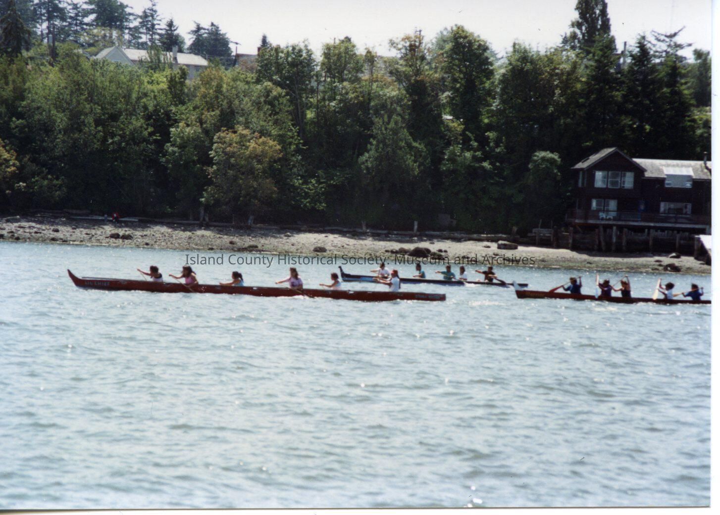 Native American Coupeville Water Festival. Color photograph. Canoe races. Three canoes with either young women or children paddling. They are going past the red house on the Cove waterfront just below Front Street east of town. They are heading towards Coupe Park.