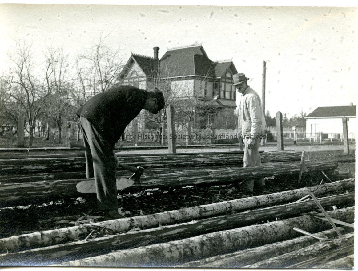 Black and white photo of two men standing in a field looking at rows of logs or timber laid out. One man is bent over using an ax. There is a large Victorian-style house in the background. On the back: Coupeville playshed.
