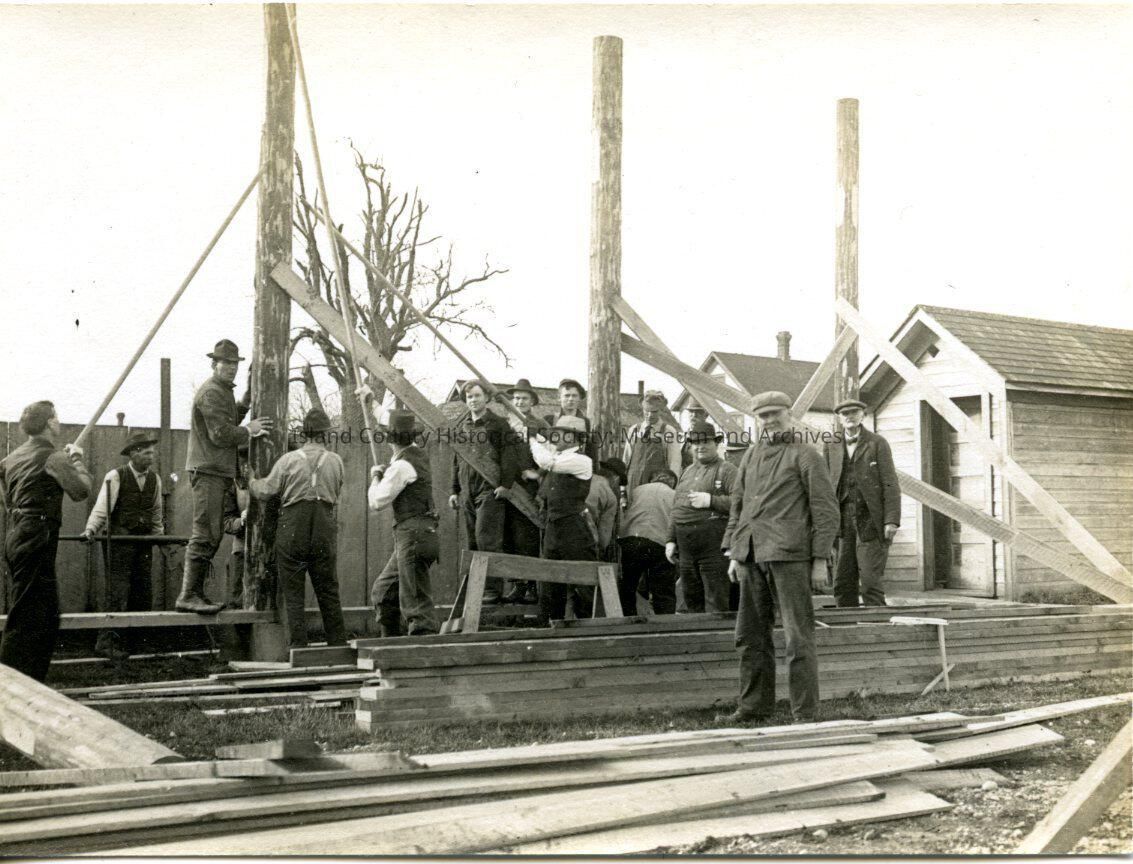 Black and white photo of 18 men building the playshed. Some are holding poles holding up a vertical pole. Timber and other logs are on the ground. There are three small buildings on the right and a fence along the back.