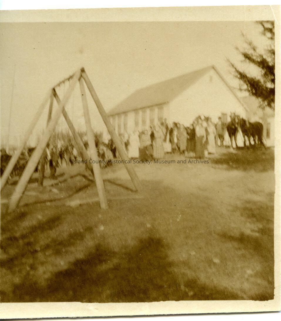 Black and white photo of a playground - large building in the background, group of men, women and children standing around. A team of horses on the right. A swingset in the center left. Photo is blurry.