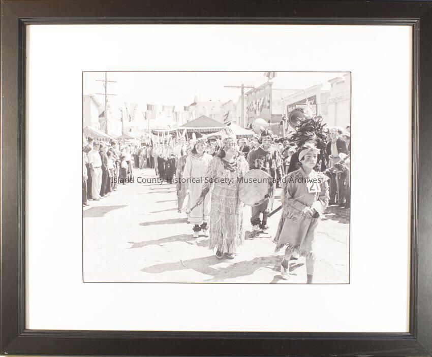 A street sceen from a 1930's Water Festival in Coupeville. The photographer is looking east down the street with a group of native americans walking twoard the camera. The person leading the procession appears to be a young boy. The number 21 is on his chest. Behind him are a number of women with fancy head dresses, clothes, and instruments. The street is lined with caucasian spectators. Flags are strung across the street.Collection