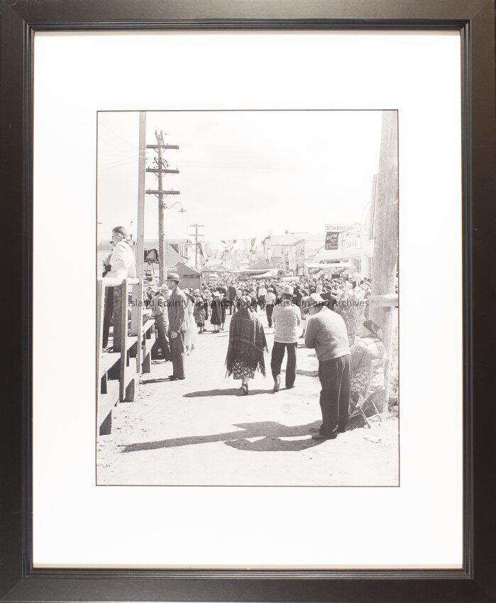 A street sceen from a 1930's Water Festival in Coupeville. The photographer is looking east down Front Street. Most of the people in the photo are seen from behind. The stree is full of people. Flags are flown over the street. Annie Fredrick can be seen walking away from the camera wearing her plaid shawl.
