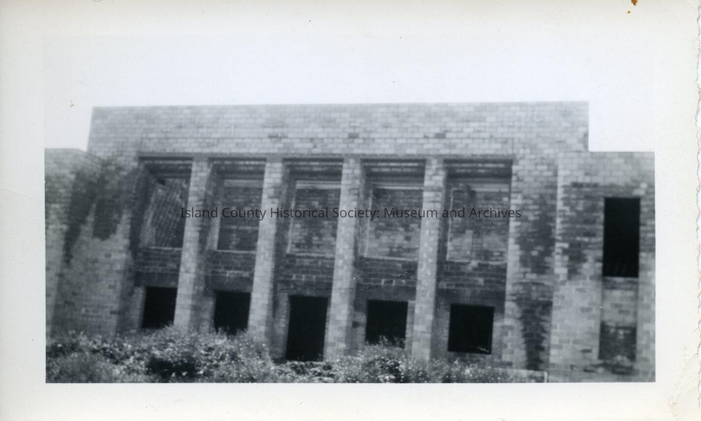 An image of the current courthouse as it was bing constructed. Only the brick has been layed, there are no windows or doors. It has not been plastered and rather looks abandoned as opposed to new construction. The view is a close up of the previous image.