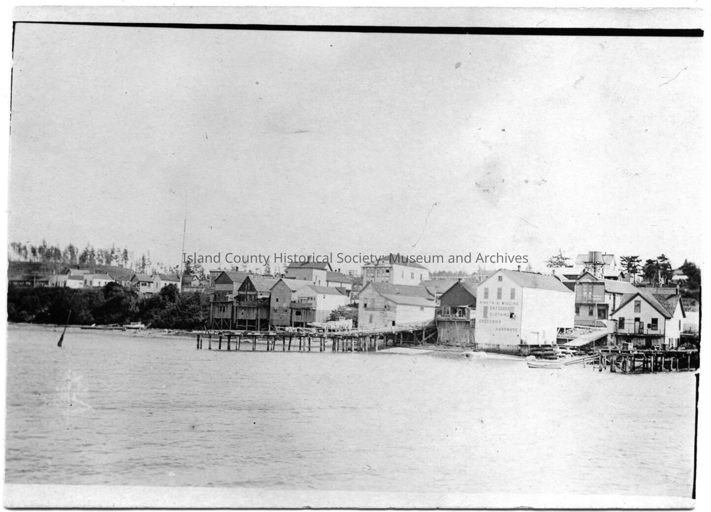 Black and white photograph. Penn Cove. Water with Coupeville in background. Academy, hotel, and houses on hills. East of dock to Pennington Hill. Dock and Robinson's dock. Written on back: Early Coupeville from water. Given by Jay A. Bailey Jr.
