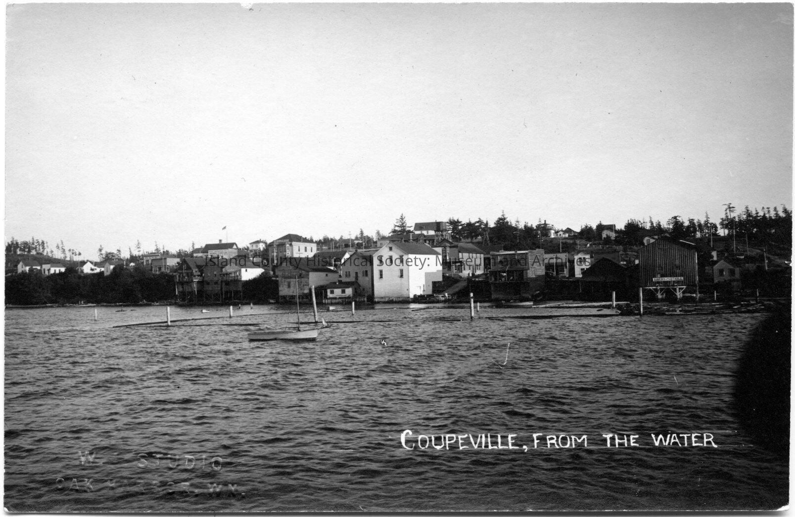 Black and white photograph. Penn Cove. Water with Coupeville in background. Academy, hotel, and houses on hills. East of dock to Pennington Hill. Small sailboat in foreground. Pilings in water with booms enclosing area near shore. Titles on front: Coupeville, from the water.