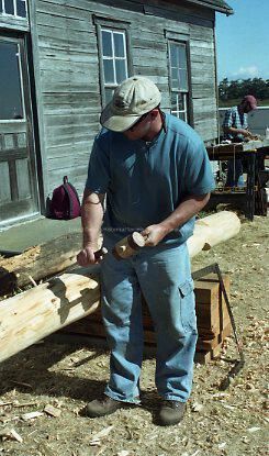 Exterior or a house under repair - man using a mallet to chip wood from a log.