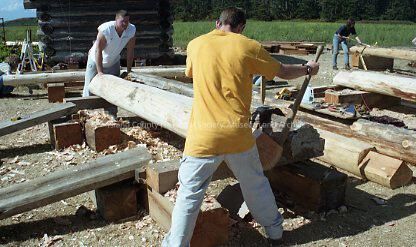 Men working on a log for reconstruction of a historic building. The building in the background is the Sarah and Jacob Ebey blockhouse.