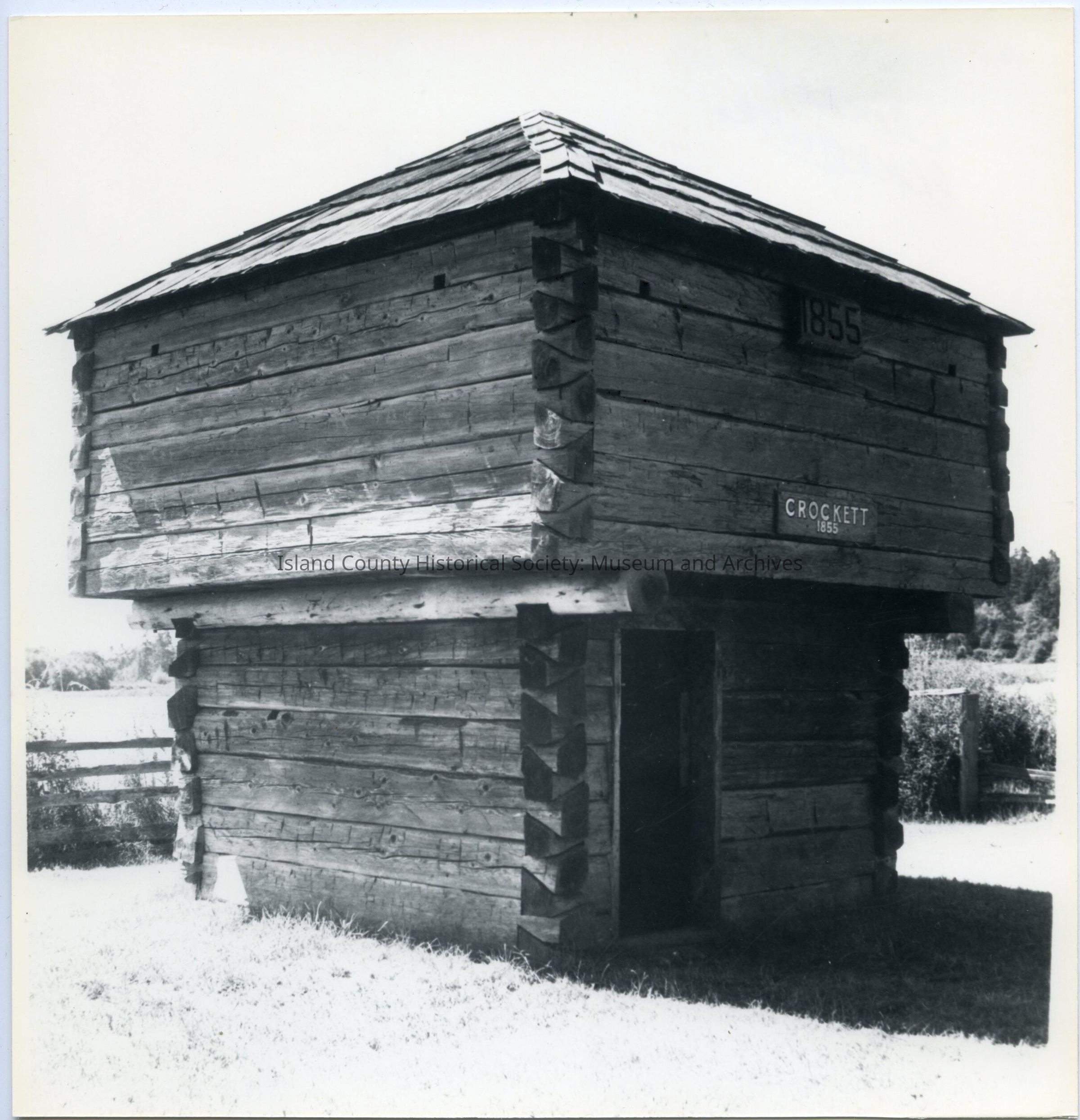 Crockett Blockhouse, black and white photo. Door side facing right. Sign over door - Crockett 1855. Split rail fence behind. On the back: Crockett Blockhouse.
