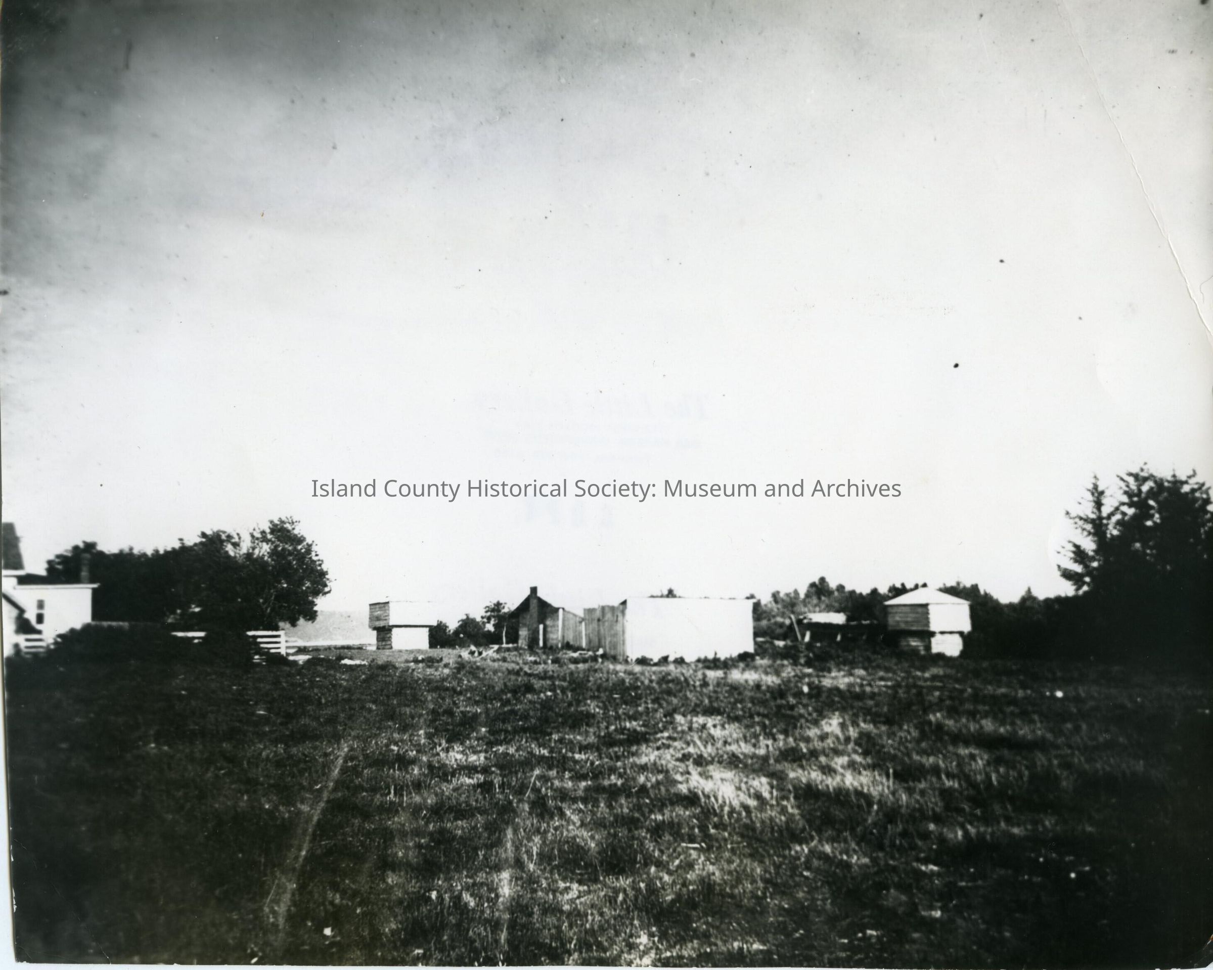 Crockett Blockhouse. Black and white photo showing two blockhouses and house and farm buildings in between.
