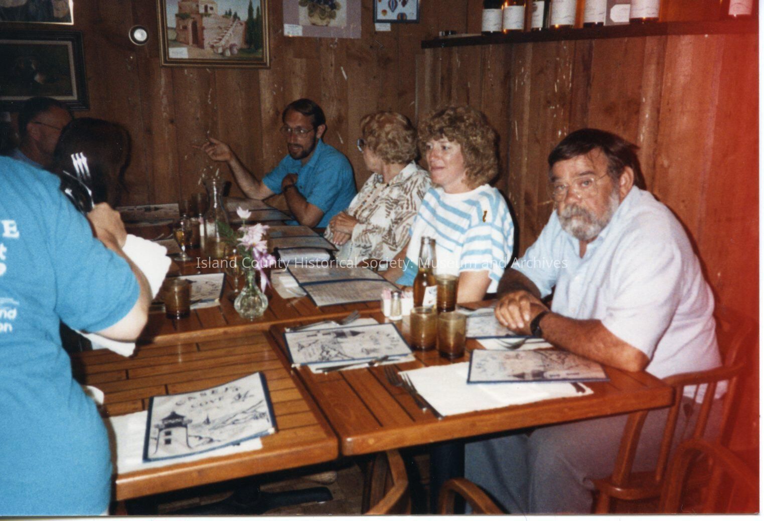 Photo of several people in a cafe. Names handwritten on back of photo are Mike Putman, Chris Christenson, Margaret Livermore. Del Bennett on right.