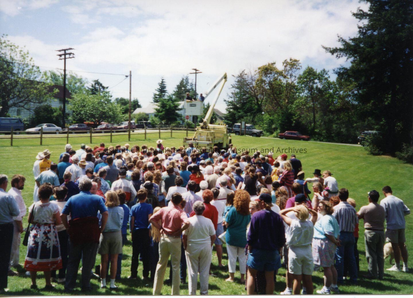 Photo of Coupeville town park. Large group of people facing machine with two people in top of. Green grass, trees. Coupeville town photo.