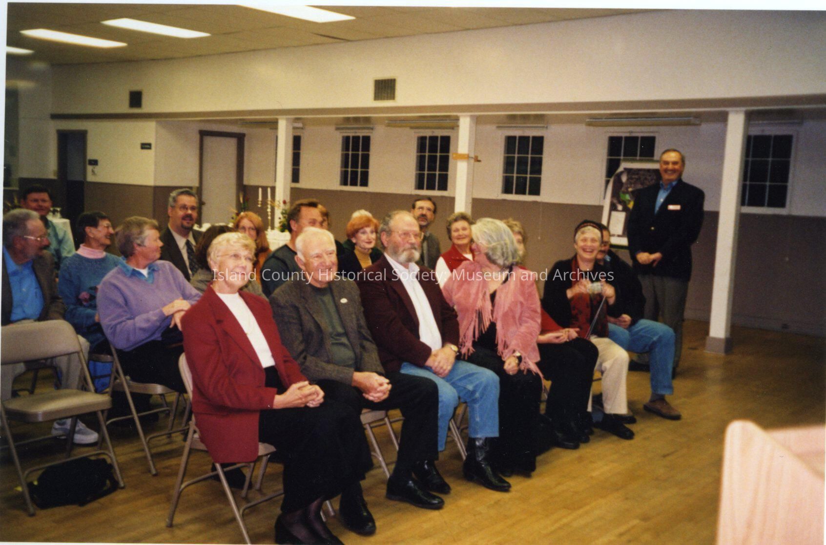 Photo of a crowd sitting and facing right in Coupeville Rec. Hall. Handwritten on the back are these names - Phyllis and Al Sherman, John and Beuye Weber, Jan Pickard, Val Arnold and Bob and Joan Lappu.
