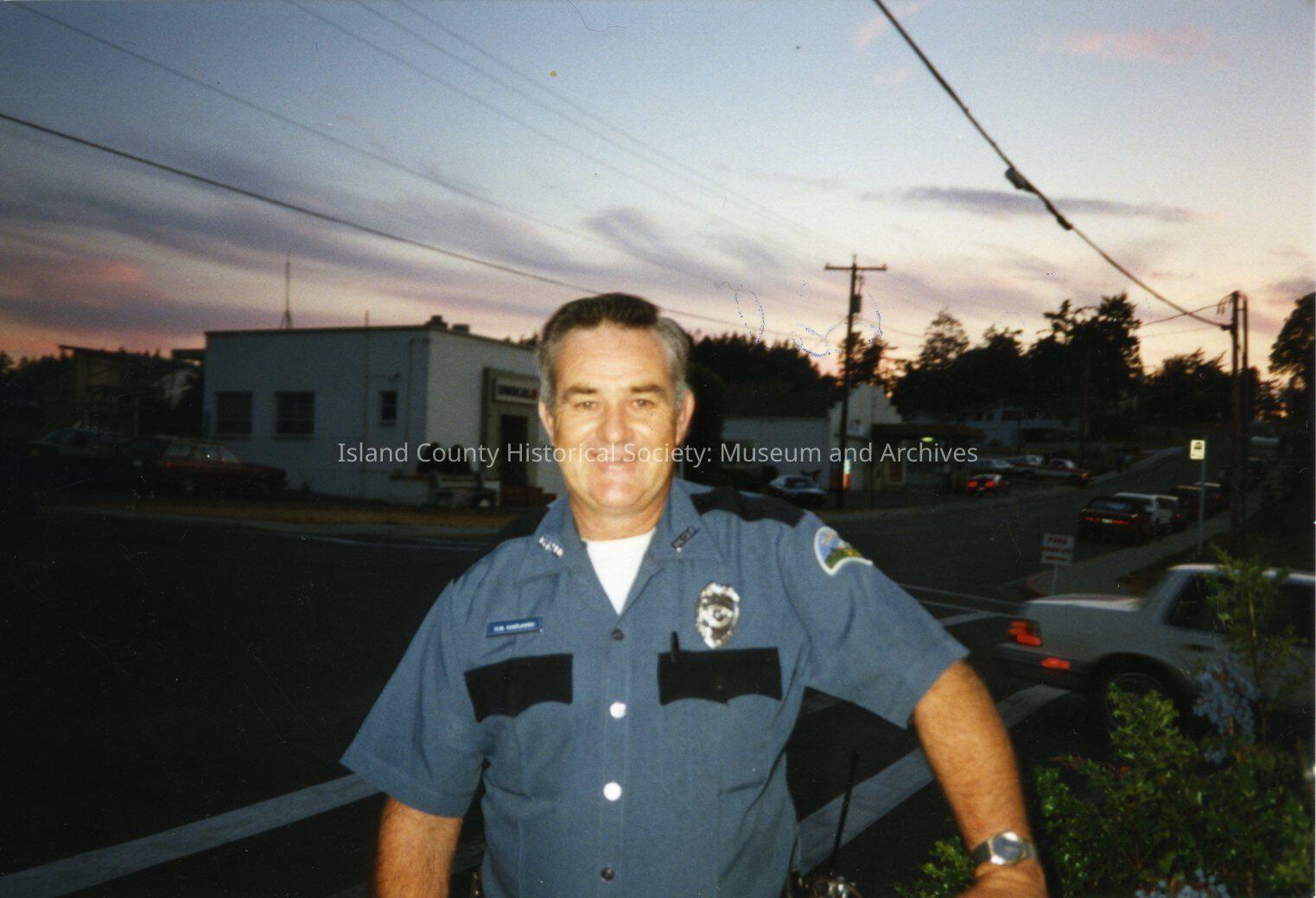 Police Officer standing on the street in Coupeville. Name handwritten on back of photo is Norm Samplaski.